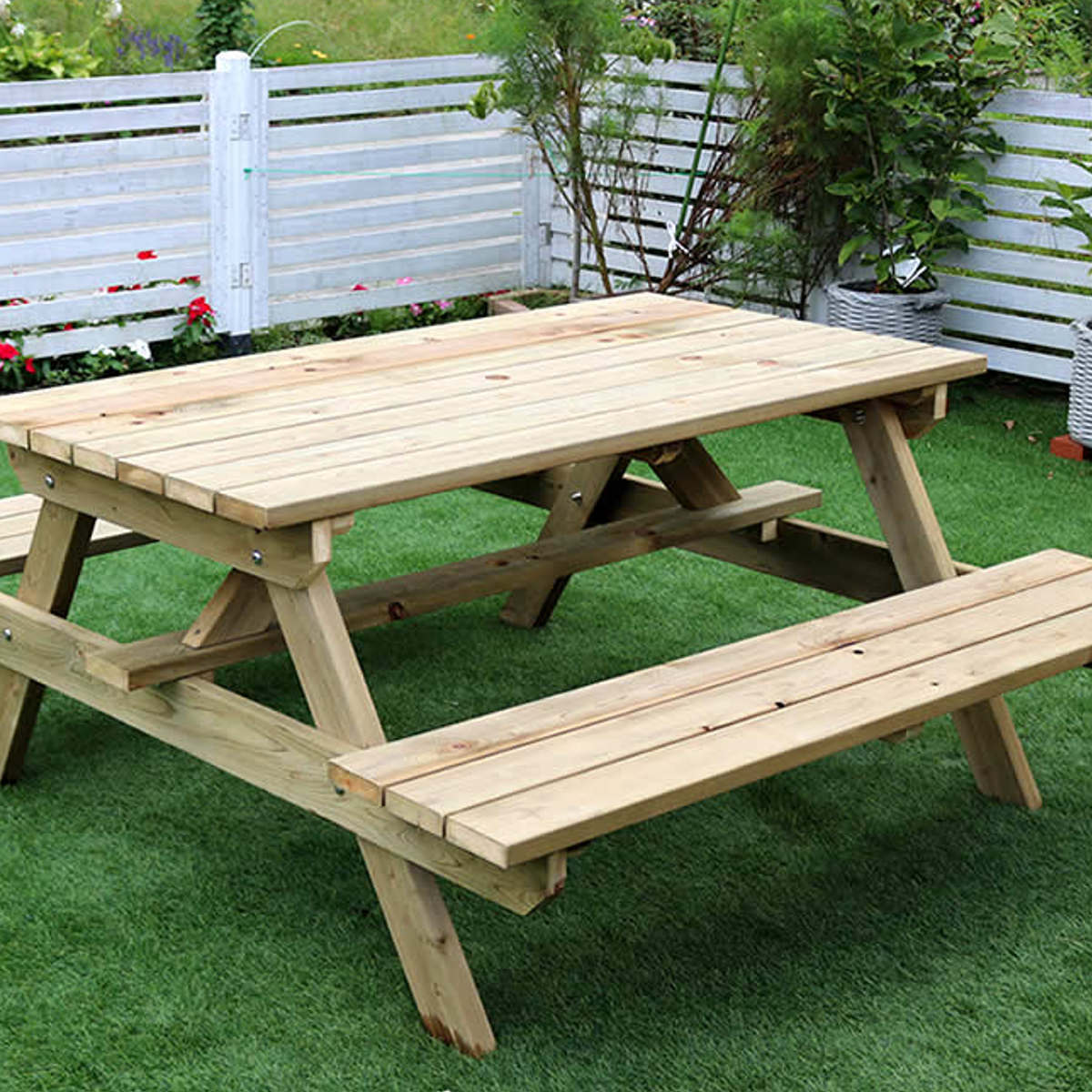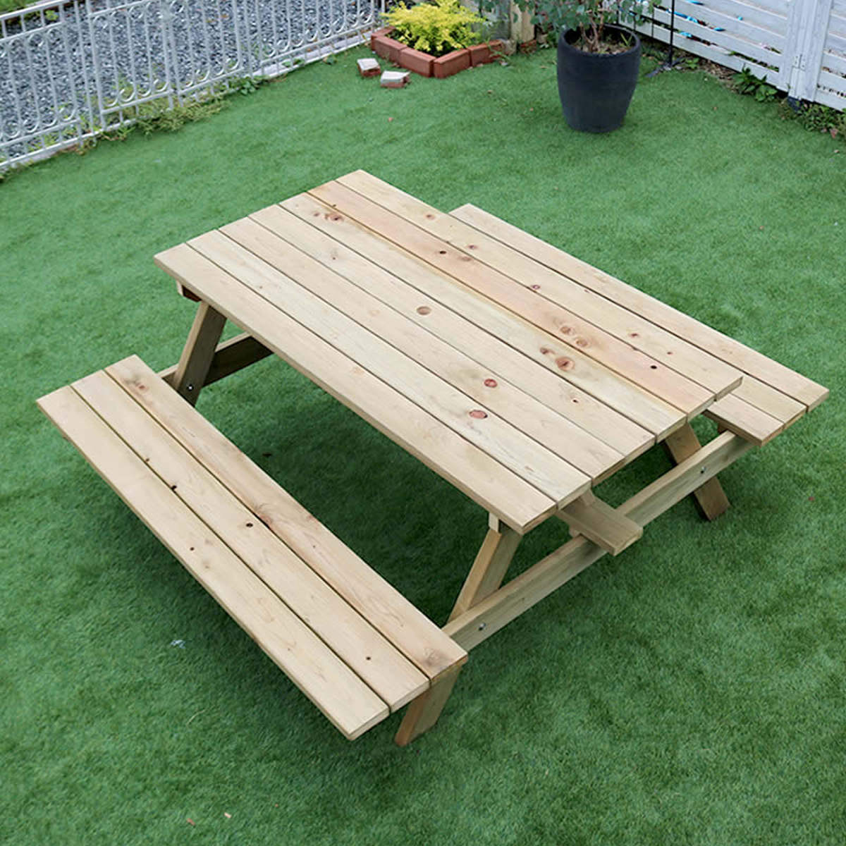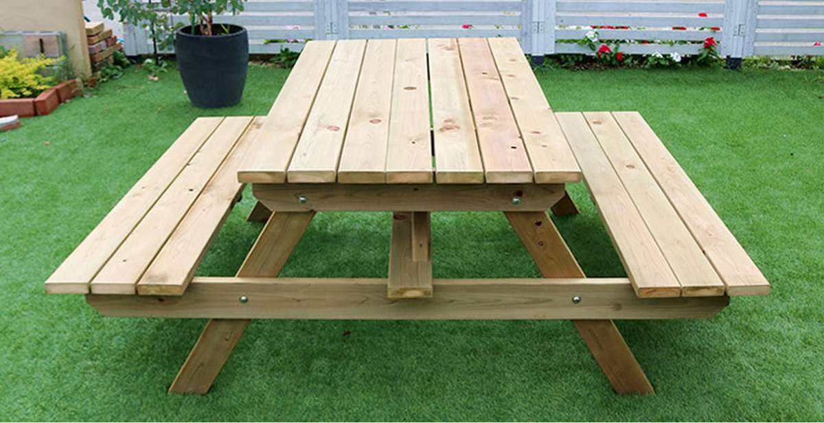 ●管理が簡単なテーブル×ベンチ一体型のピクニックテーブルです。