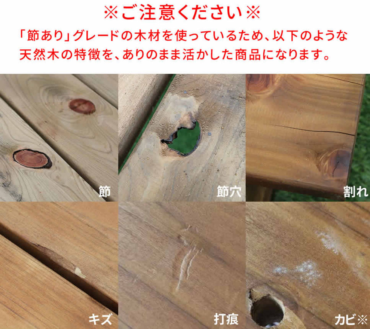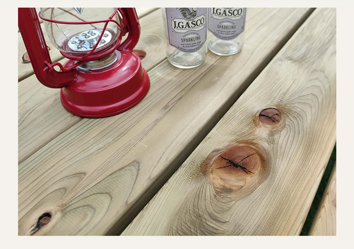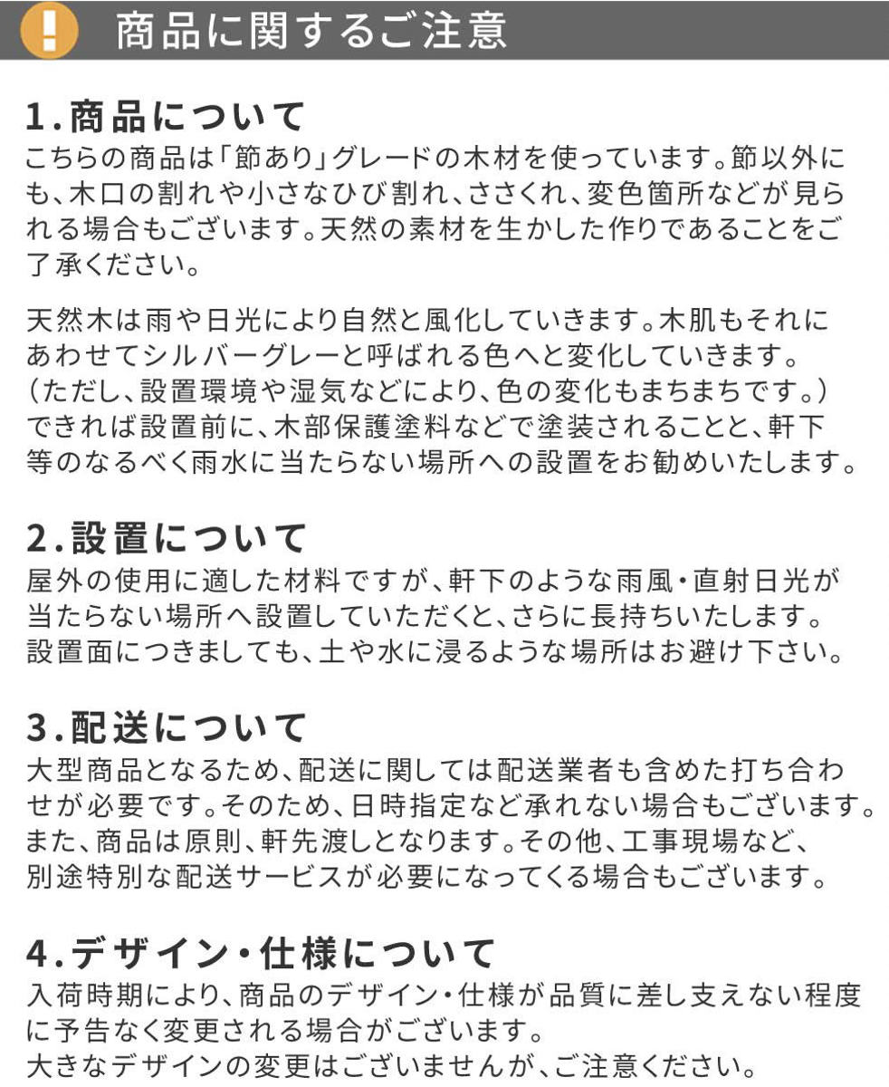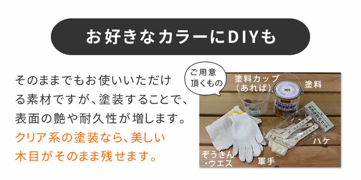 屋外向きの素材に加工されている木材のため、無塗装でのお届けになります。ひとつひとつ異なる天然の木目をお楽しみください。そのままでもお使いいただけますが、お好きなカラーにDIYするのもおすすめです。