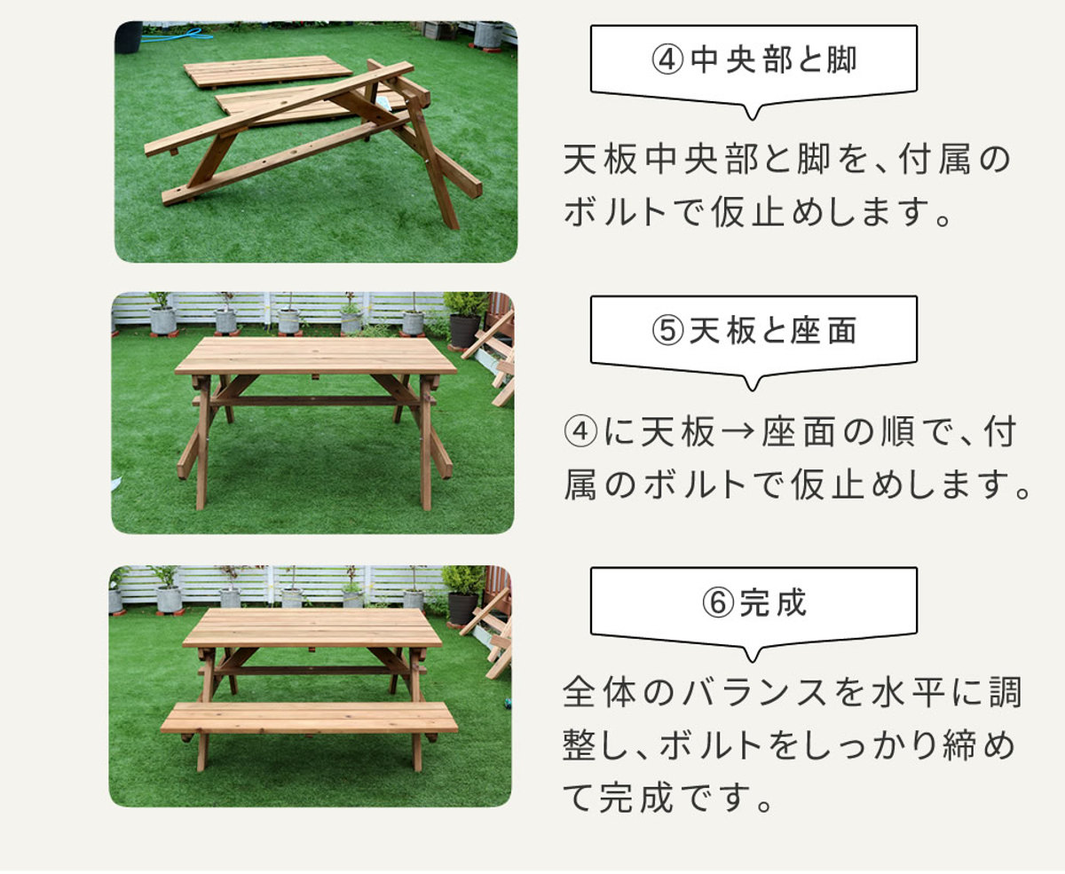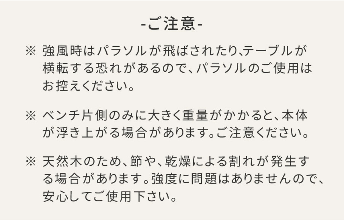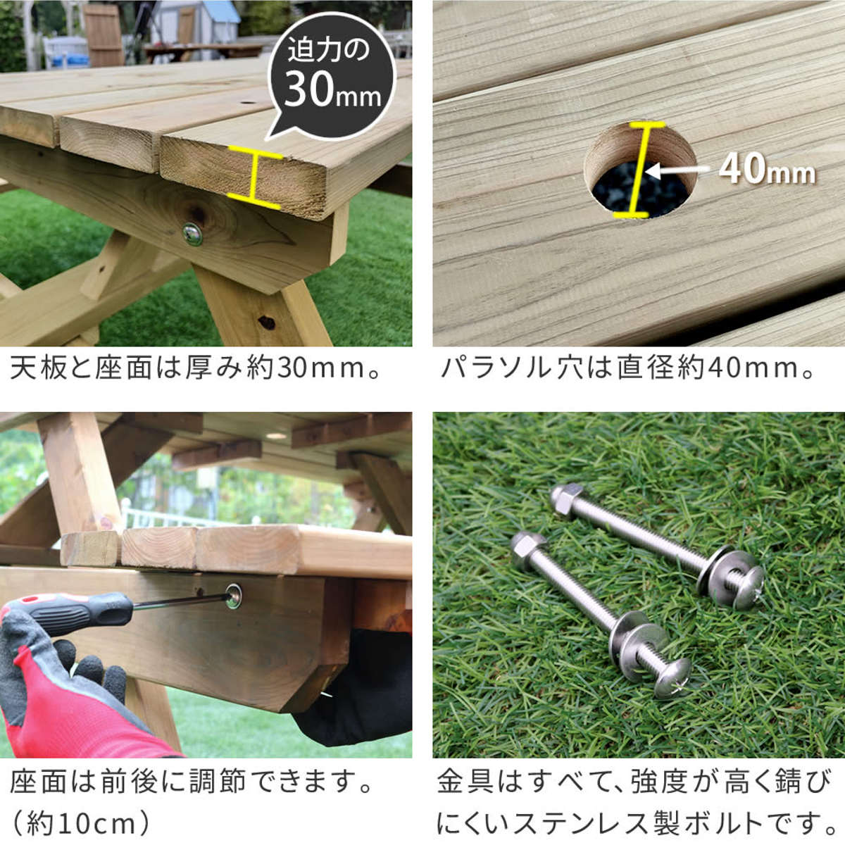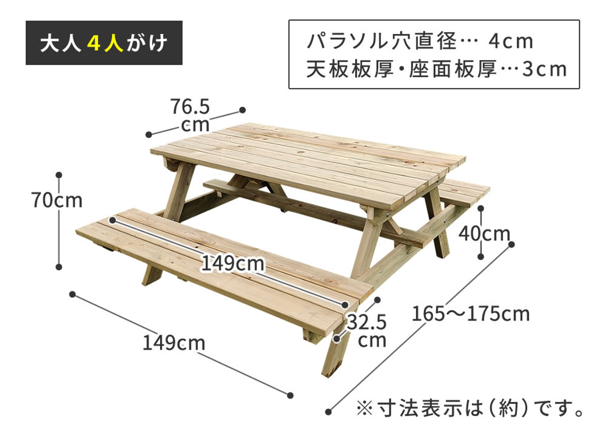 | サイズ | 本体:約 幅149×奥行165~174.5×高さ70(cm) 天板サイズ:約 幅149×奥行76.5×高さ3(cm) パラソル穴:約 直径4(cm) 座面:約 高さ4(cm) 座面サイズ:約 幅149×奥行32.5(cm) |