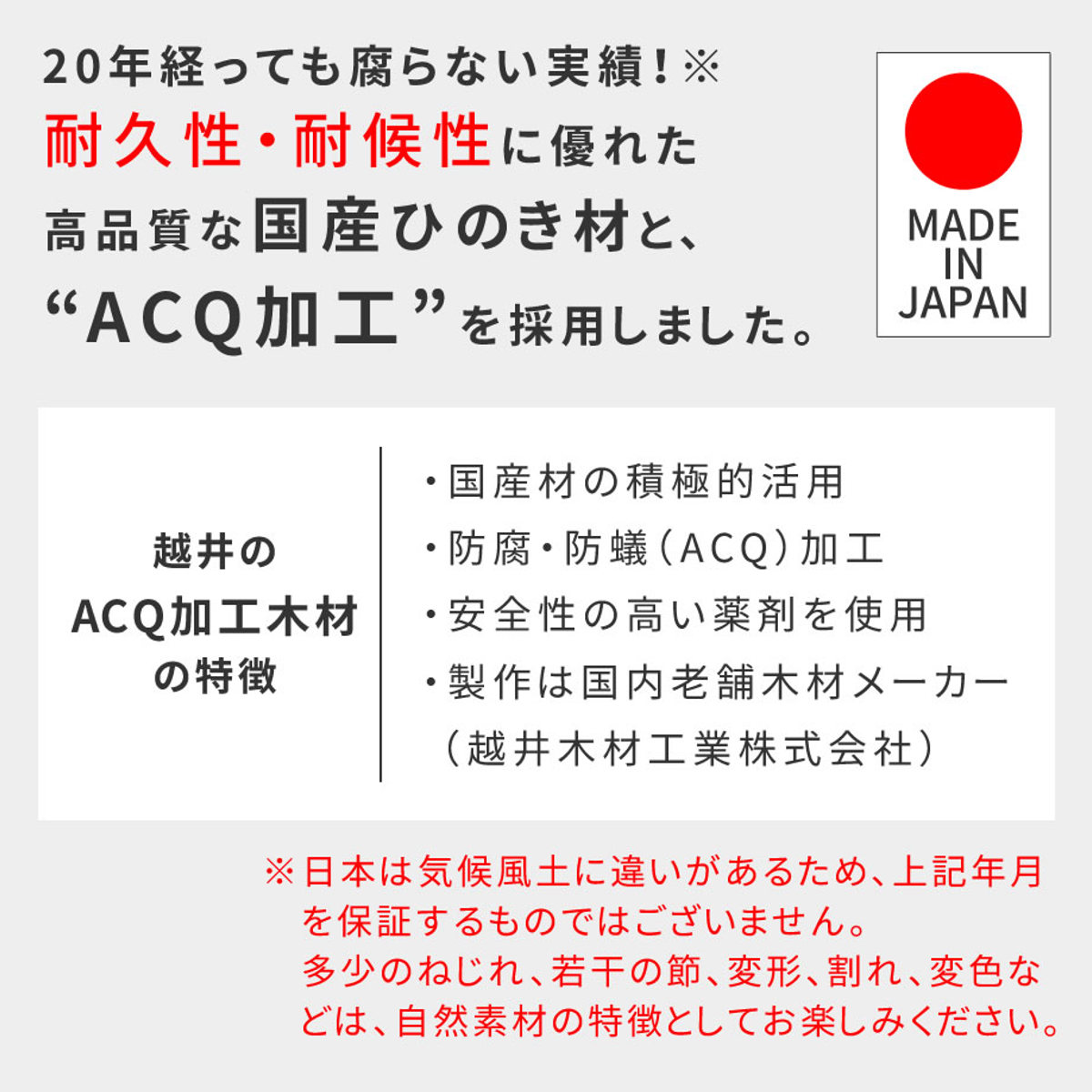 国内老舗木材メーカーの「越井木材工業株式会社」に制作を依頼。国産材の積極的活用、安全性の高い薬剤を使用しているのが特徴です。
