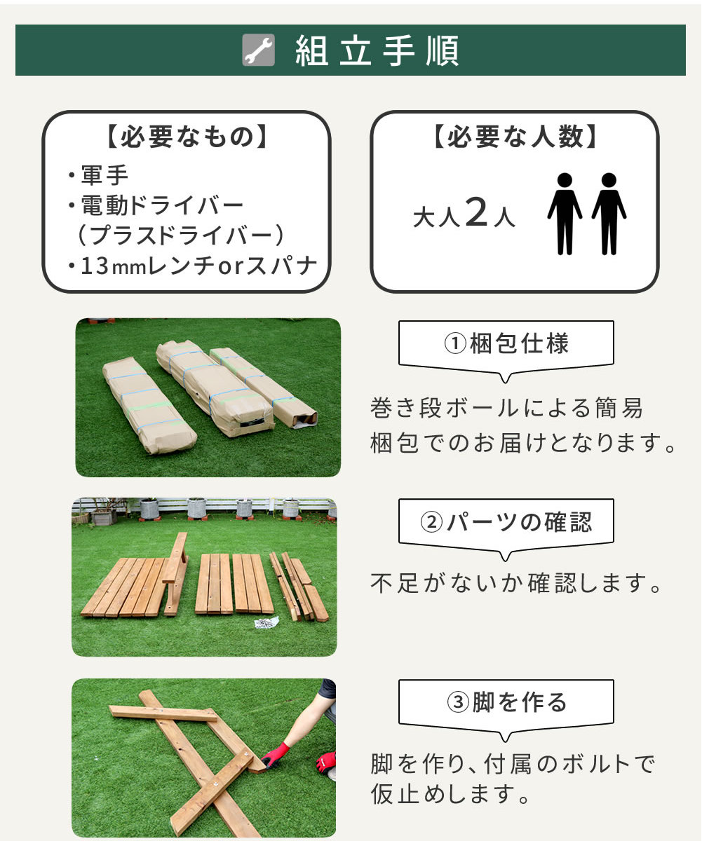 | 備考 | 【必要なもの】 ・軍手 ・電動ドライバー(プラスドライバー) ・13サイズレンチorスパナ 【必要な人数】 大人2人 |