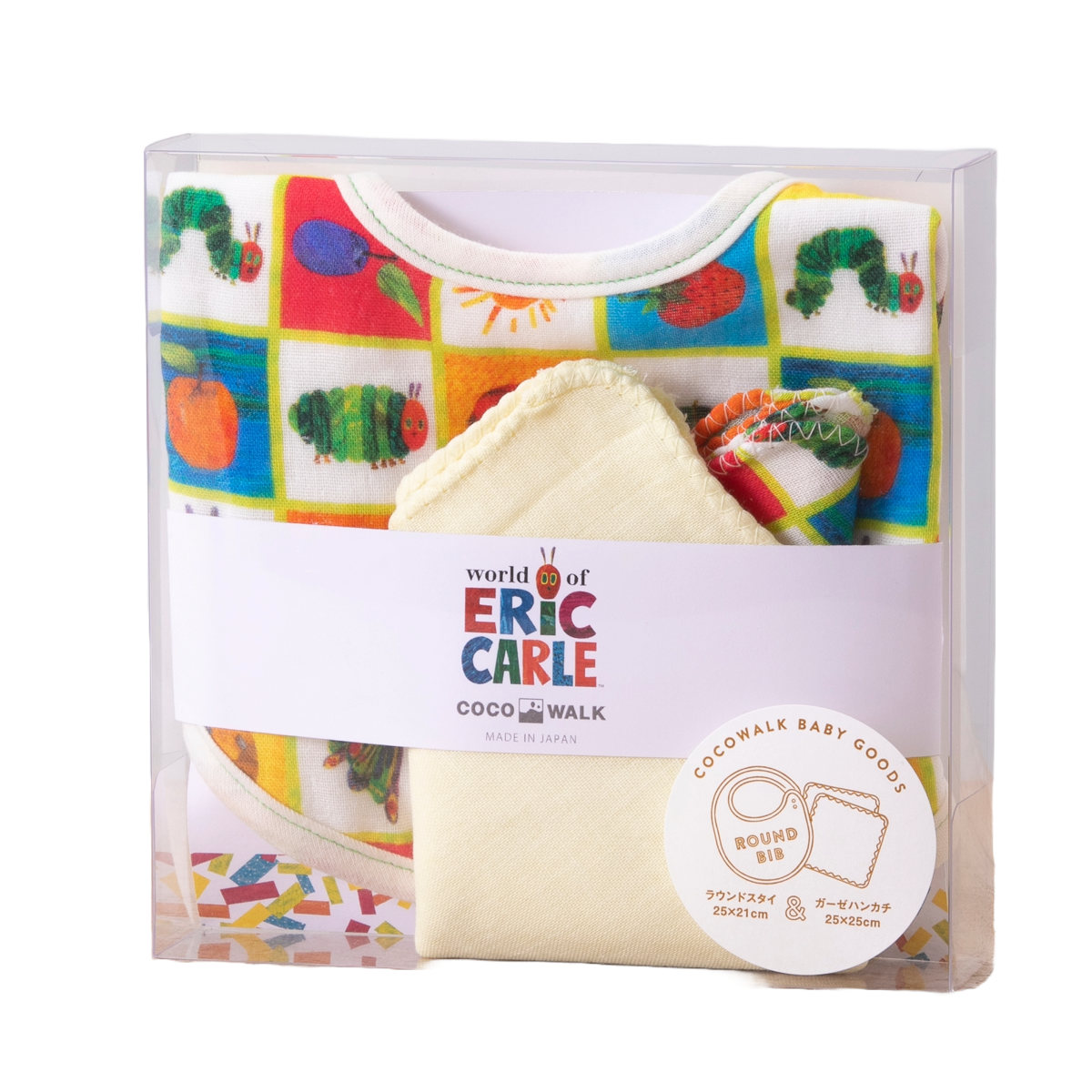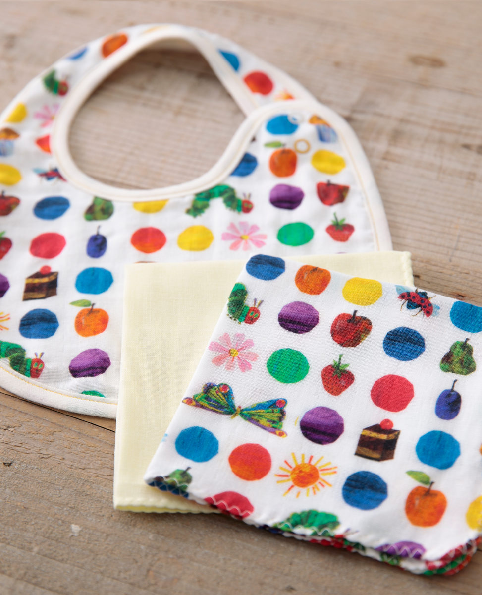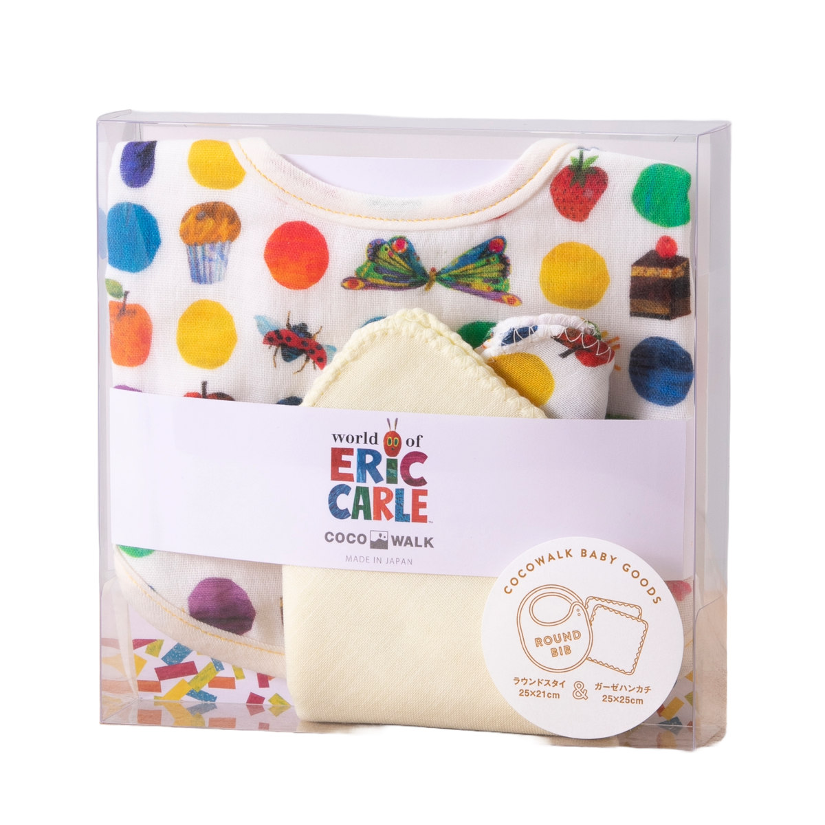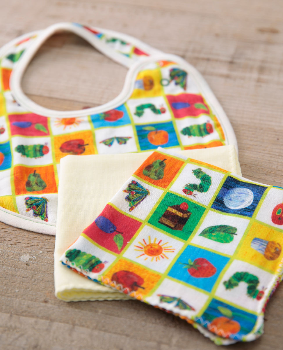 ●人気の絵本はらぺこあおむしがかわいいポップなデザインのスタイとハンカチのギフトセットです。