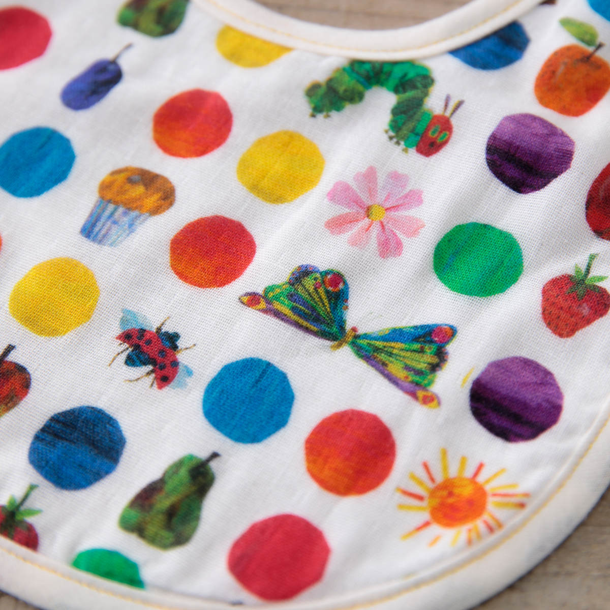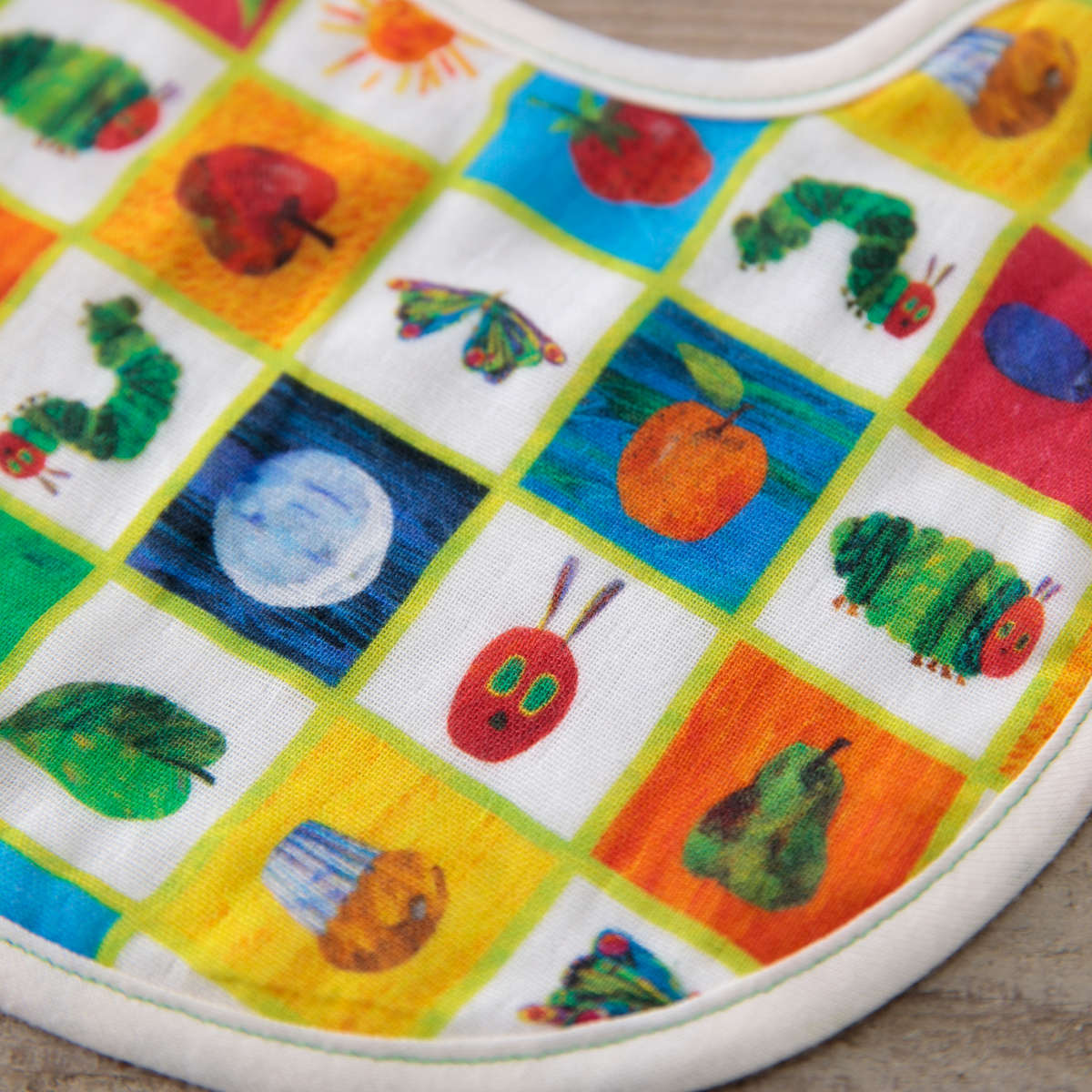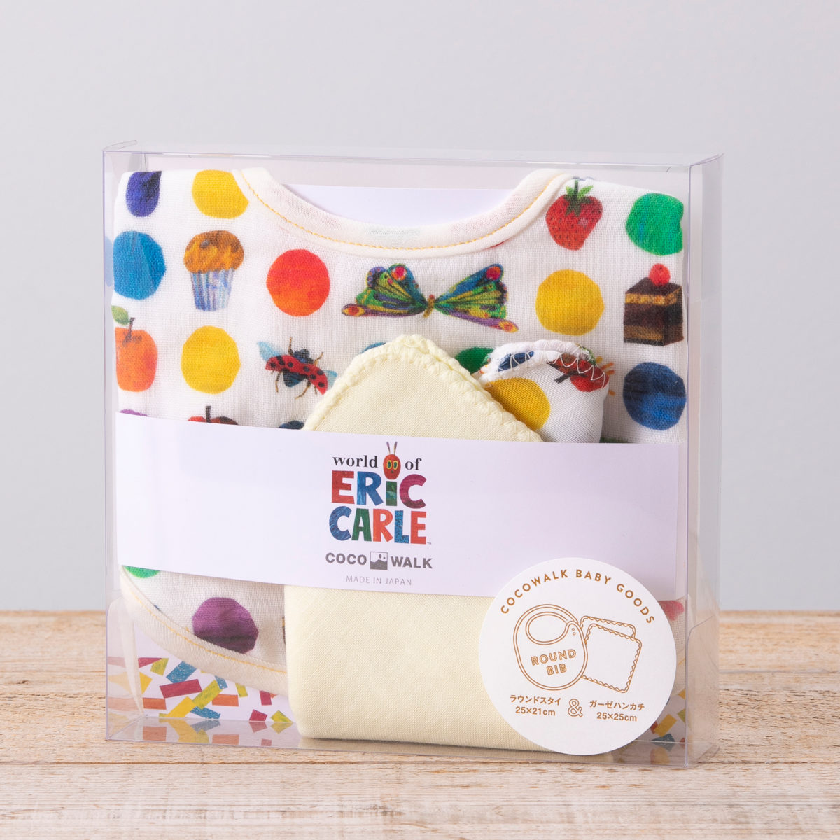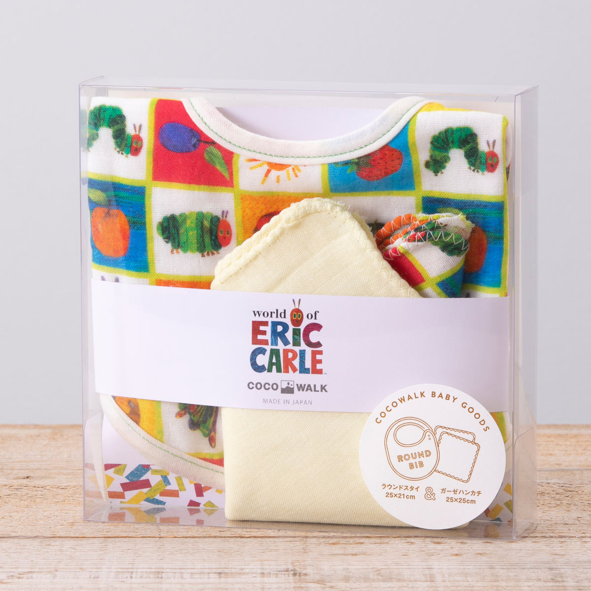 ●人気の絵本はらぺこあおむしがかわいいポップなデザインのスタイとハンカチのギフトセットです。