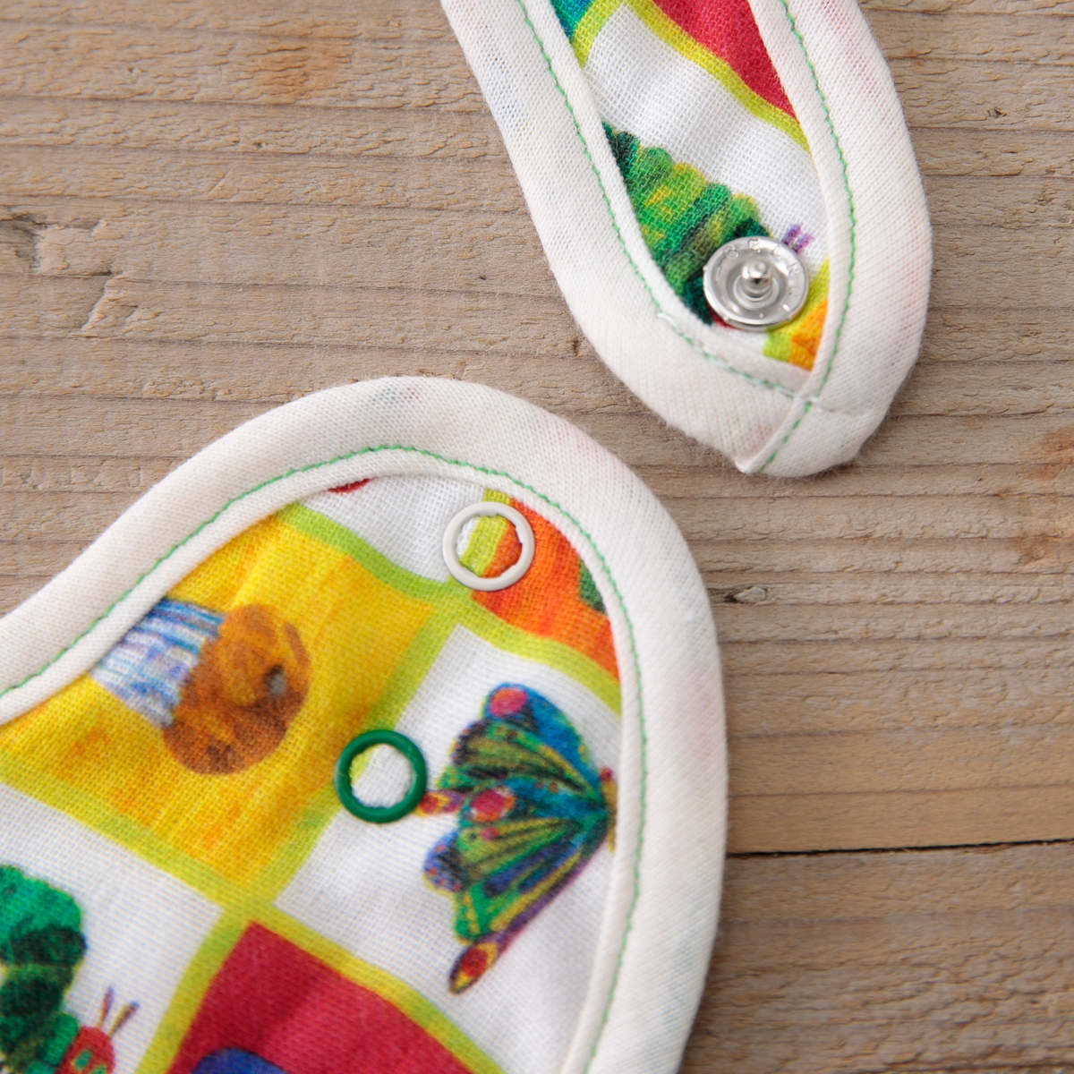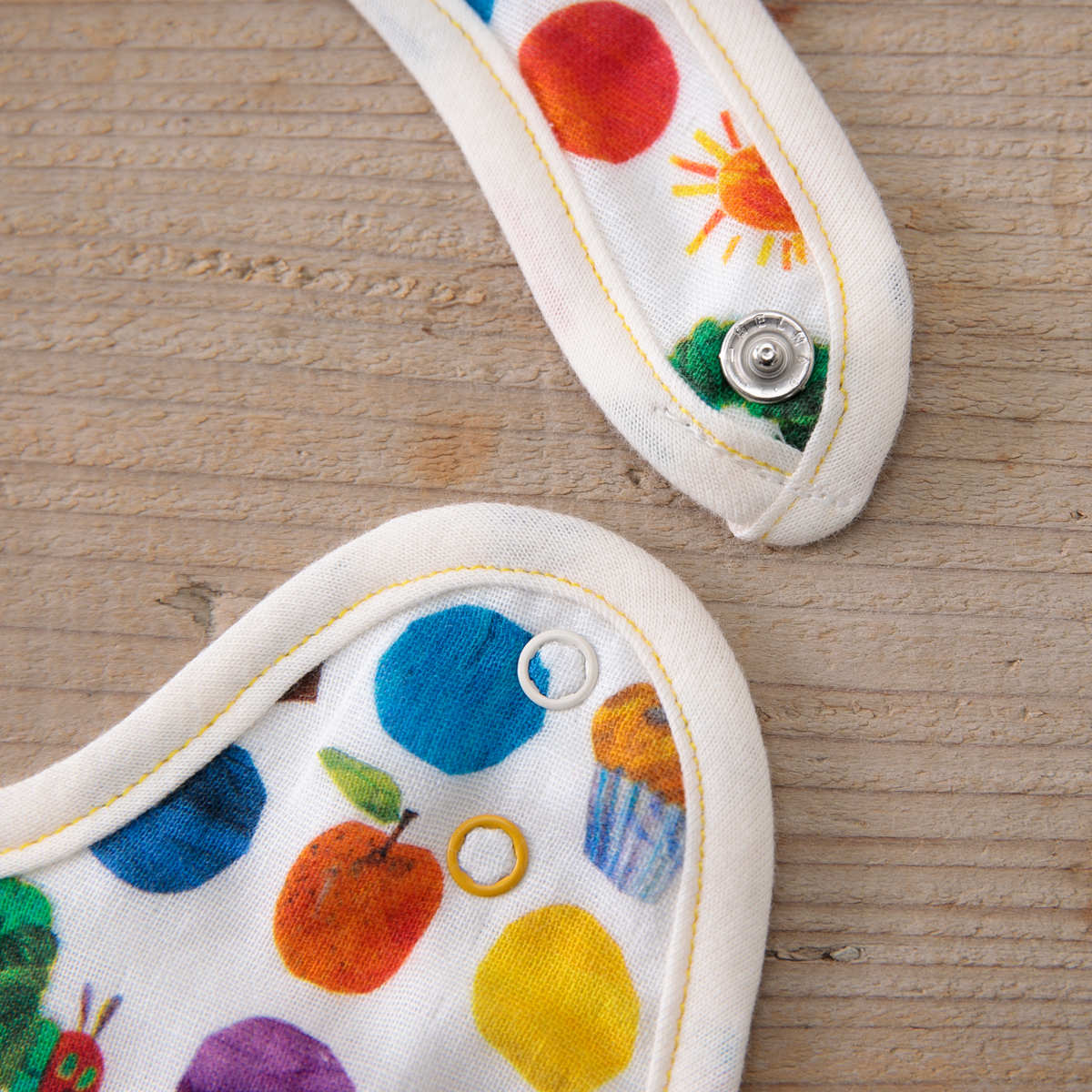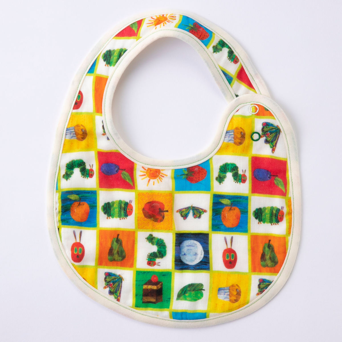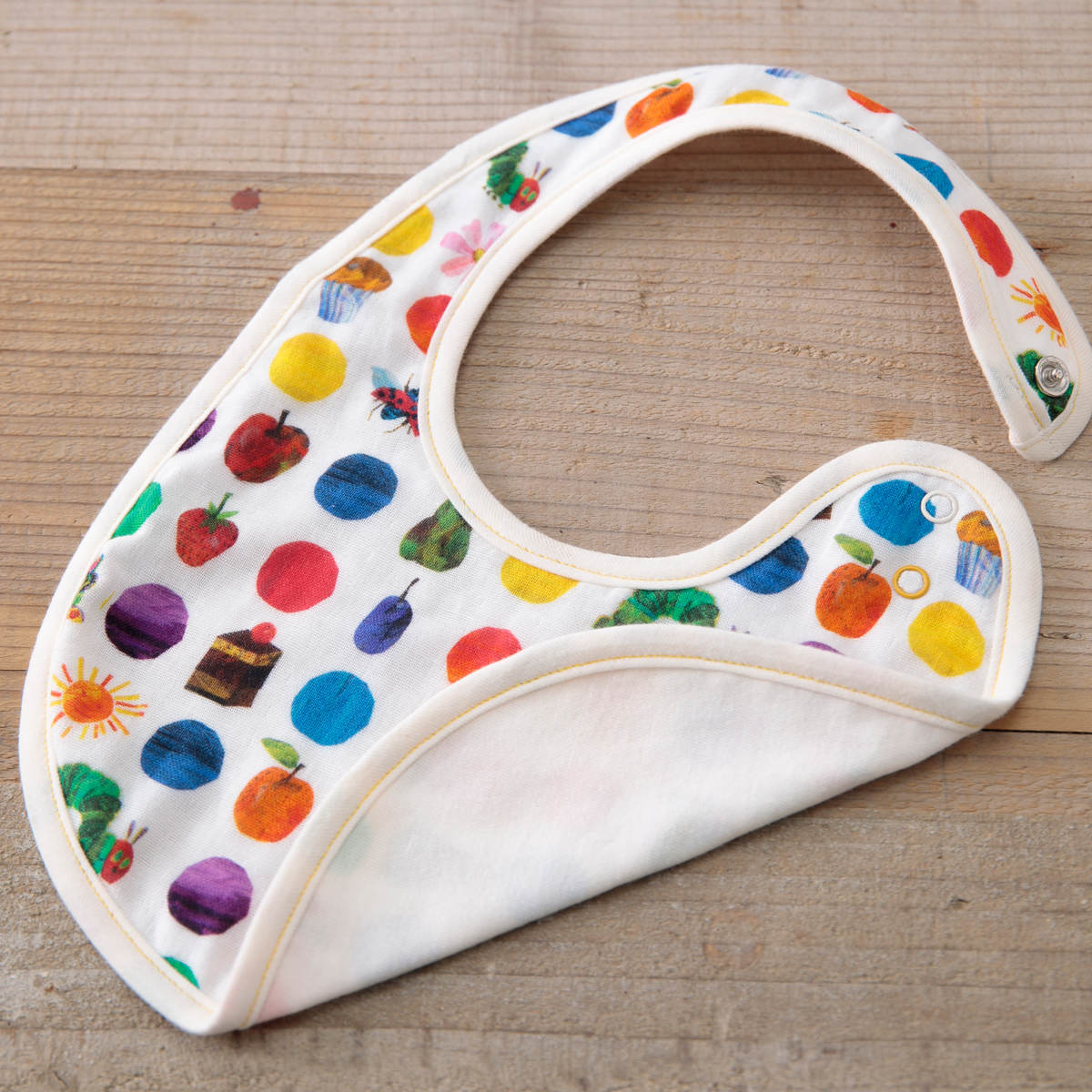 ●人気の絵本はらぺこあおむしがかわいいポップなデザインのスタイとハンカチのギフトセットです。