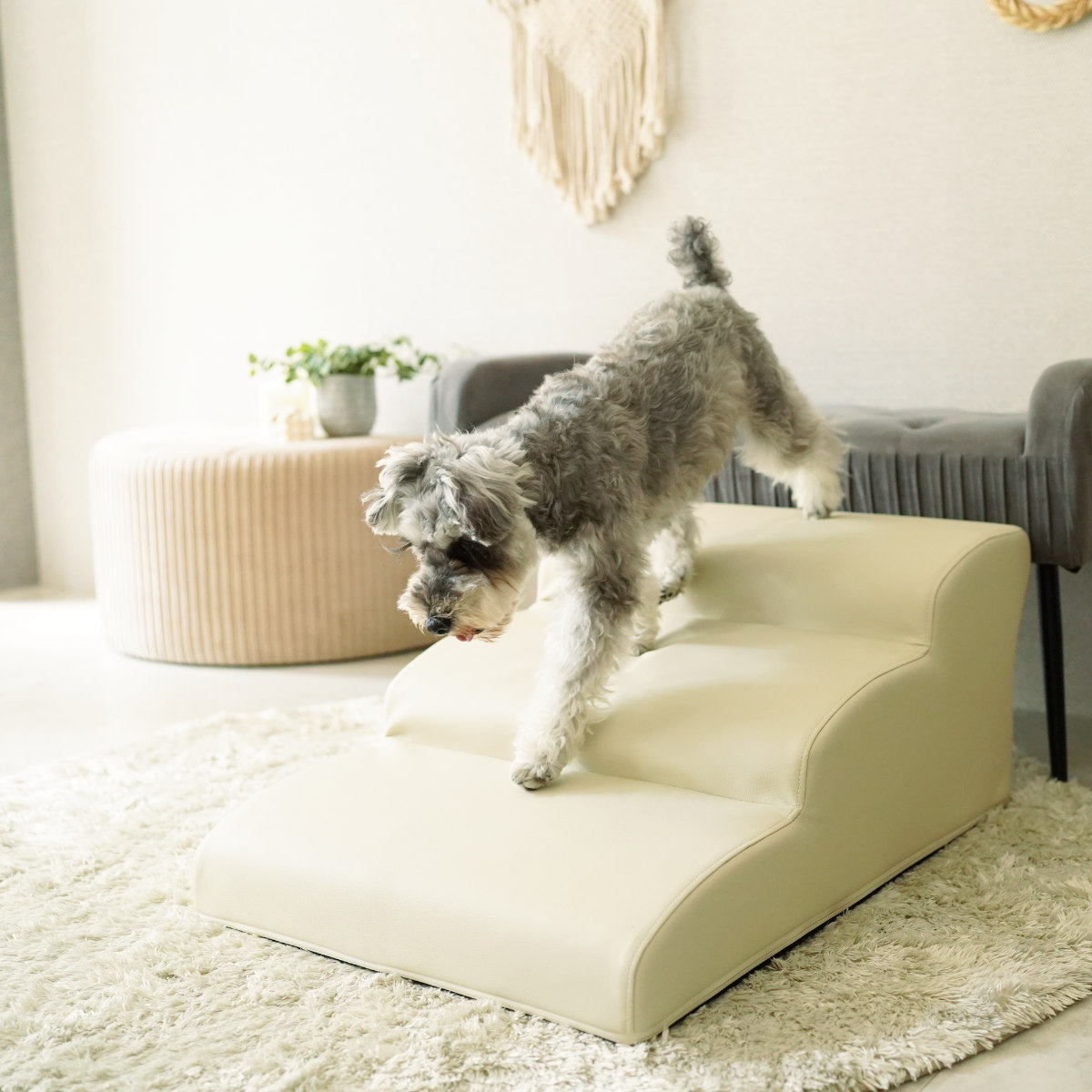 上りやすい坂のような緩やかな階段なので、胴長や小柄なワンちゃんでも上り下りしやすい設計です。