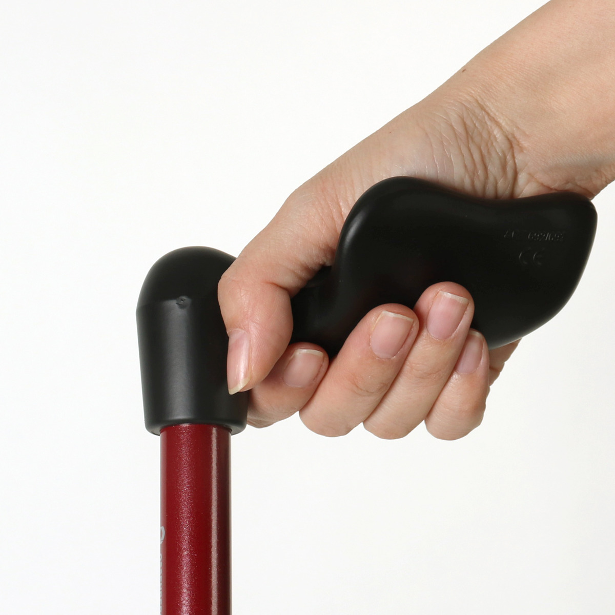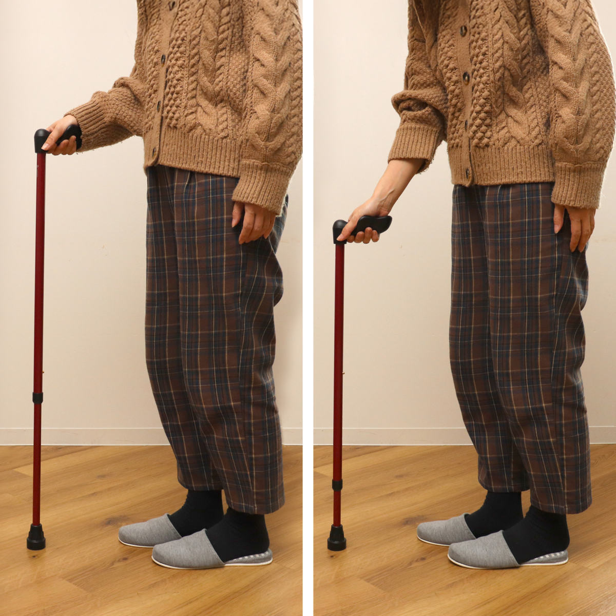 腕と杖が一直線になるように持ってください。グリップの一部だけを握ると不安定になり危険です。