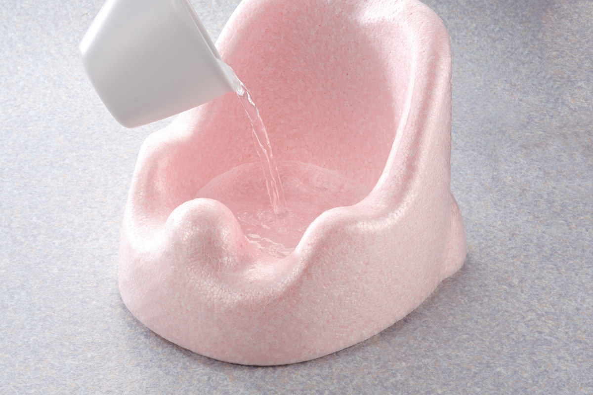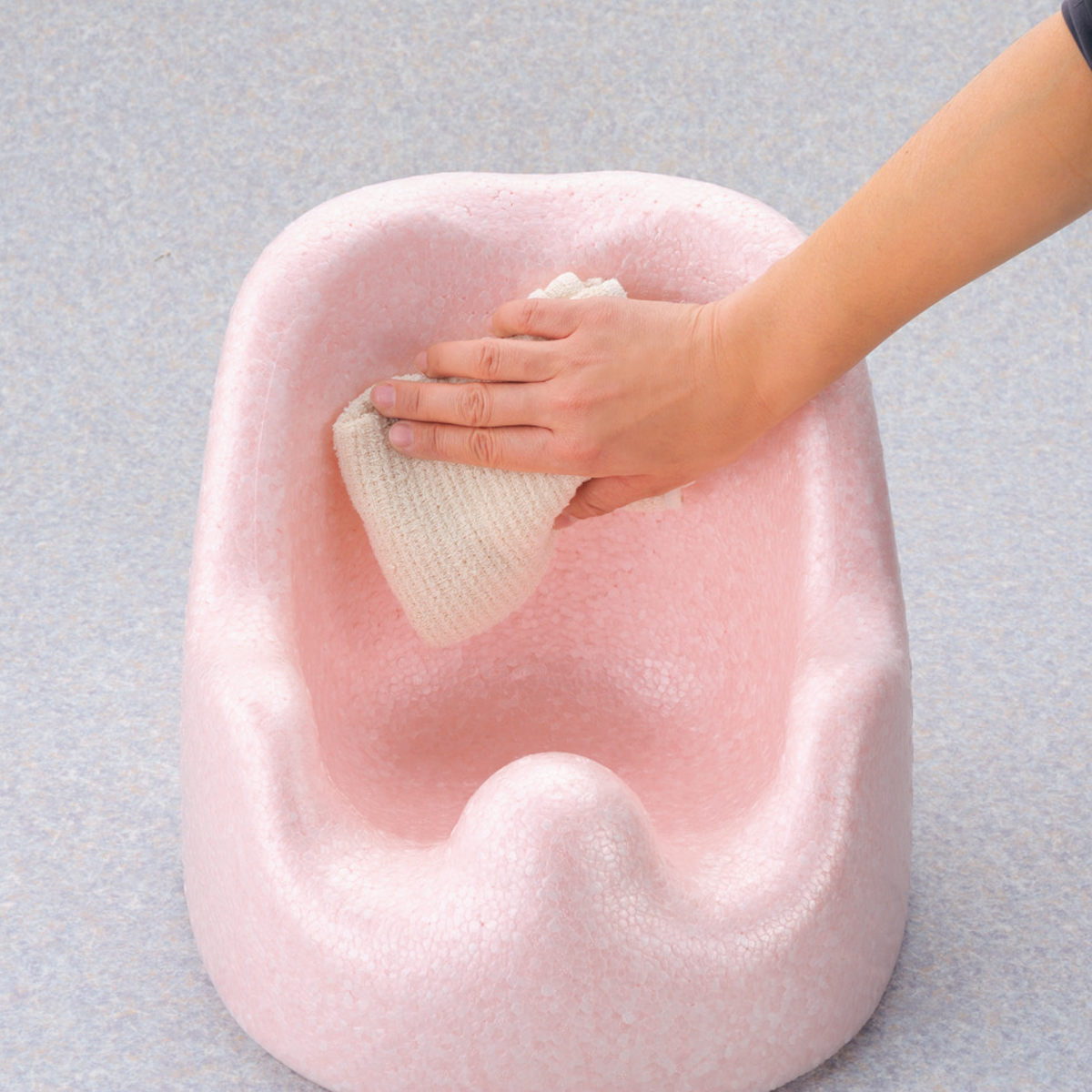 そのままでもほんのり温かい素材ですが、座面に少量のお湯をためると、さらに心地よく快適に過ごせます。おしりを包み込むような深めの座面形状で、湯たんぽのようにじんわりと赤ちゃんのおしりを温めます。