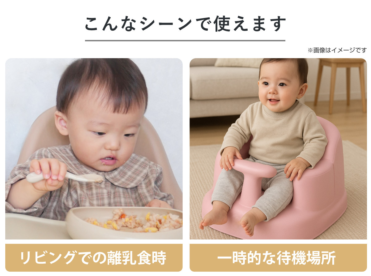 赤ちゃんのずり落ちを防ぐおしりストッパーと高い背もたれで、低月齢の赤ちゃんもしっかりお座り可能です。