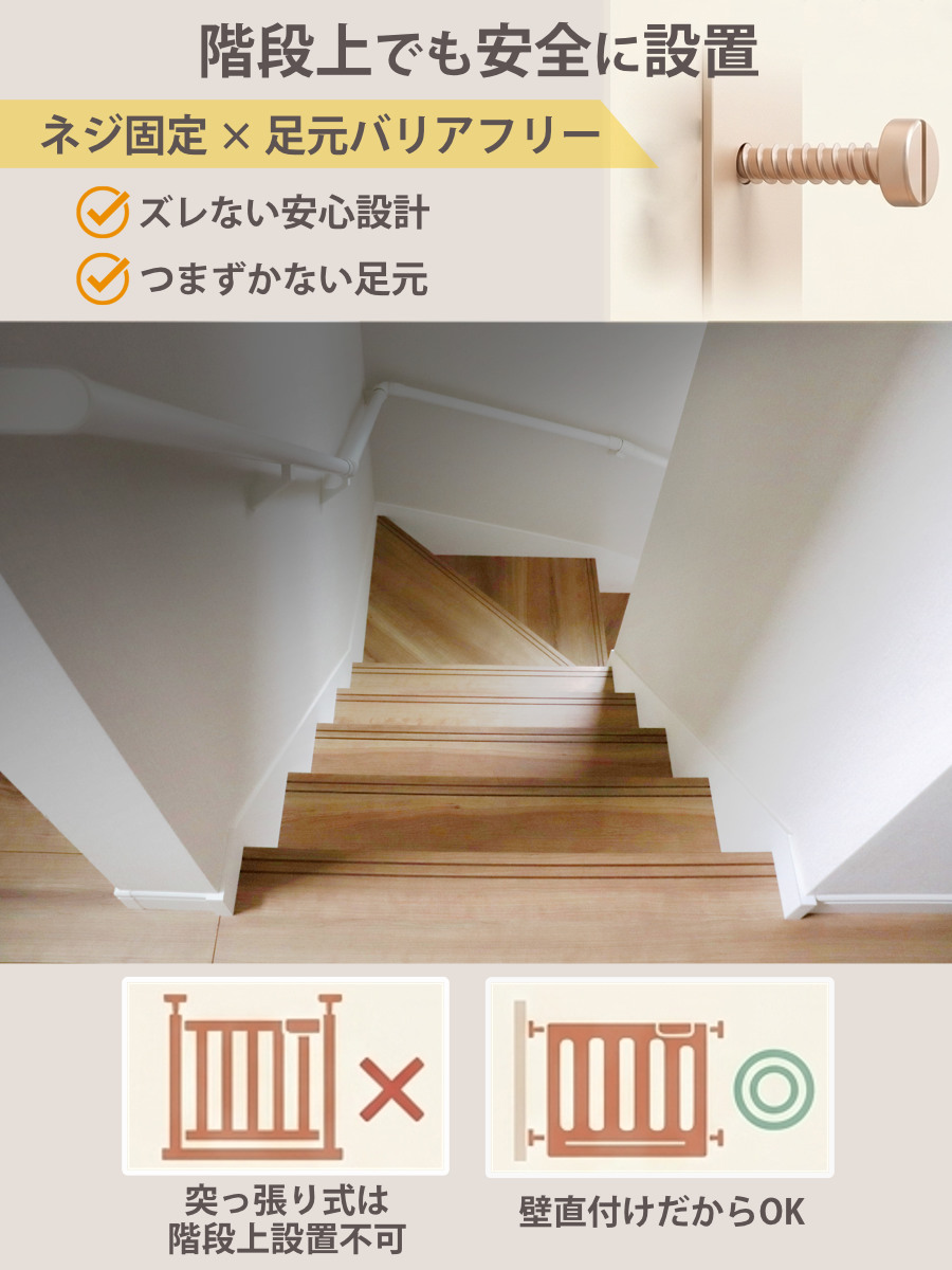 突っ張りタイプではなく、ネジでしっかり固定するタイプです。寄りかかっても倒れにくく、階段上にも設置できるため、お子さまの転落防止に役立ちます。