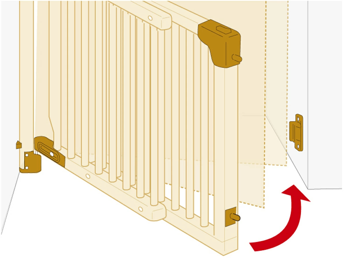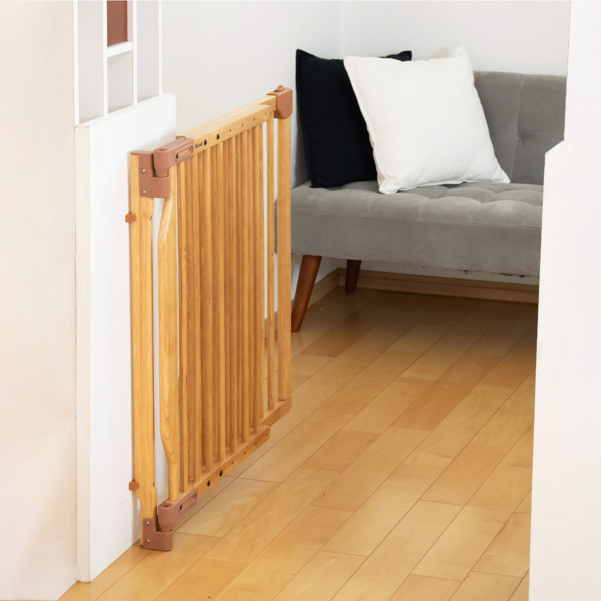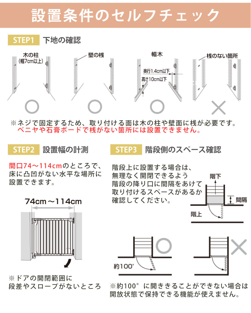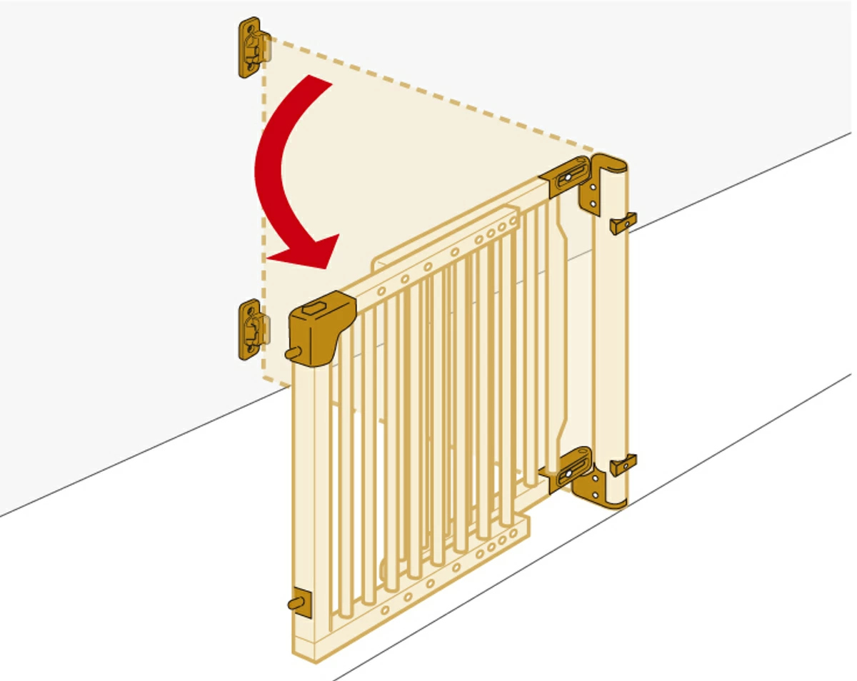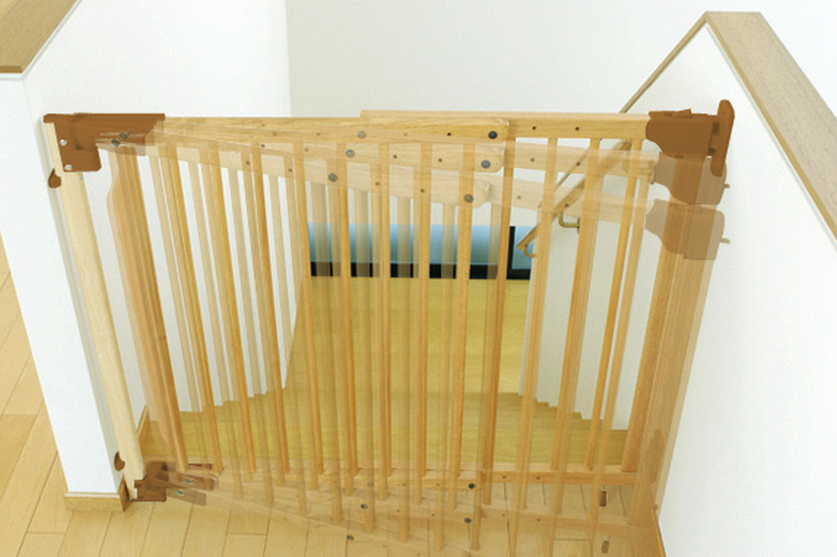 ドアが階段側に開かない片開きタイプです。間口74~114cmに対応し、お子さまが動き回るようになると気になる階段からの転落を防ぎます。