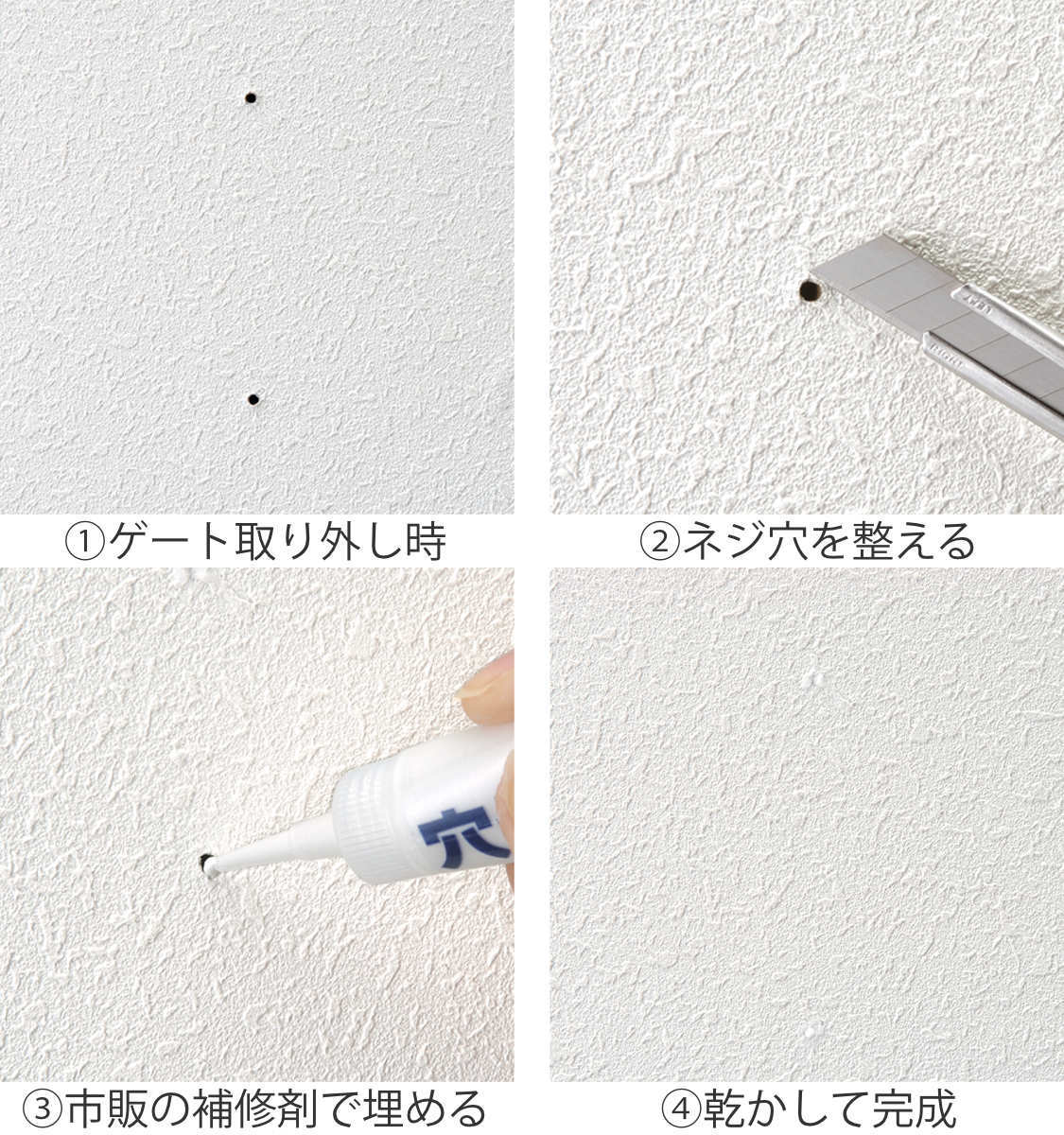 各ご家庭の設置場所に合わせて、ホームセンターなどで販売されている補修剤使うと壁面や柱に残ったネジ穴を補修できます。