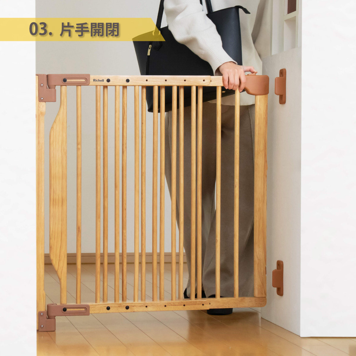 赤ちゃんを抱っこしたまま、片手でスムーズにロック解除ができます。片手で扉の開閉ができるので、パパ・ママ自身の転倒も防ぎます。