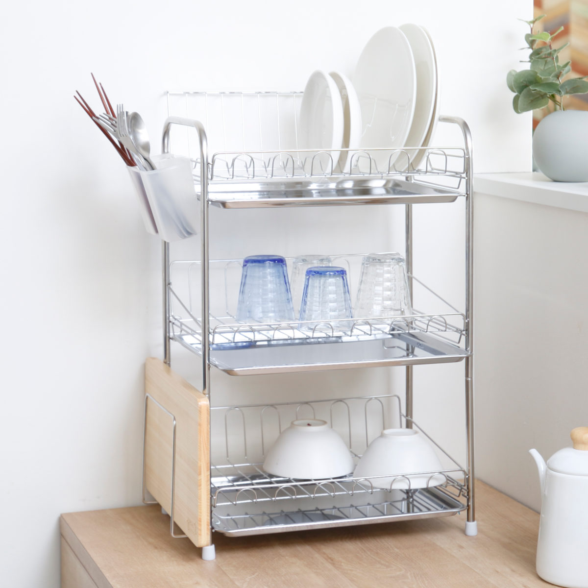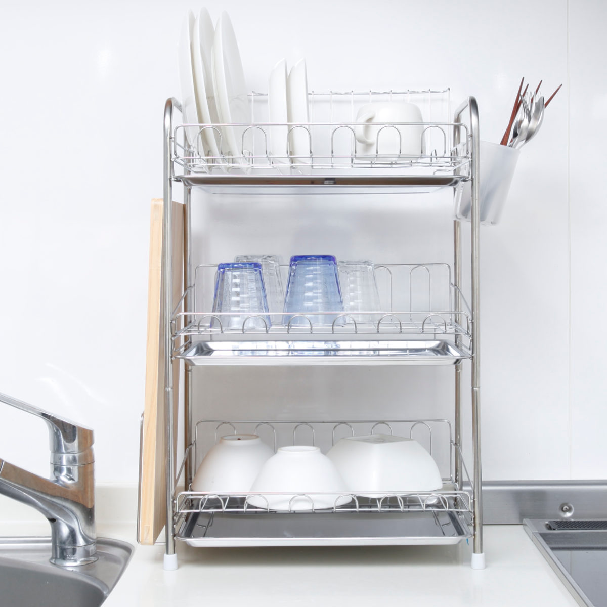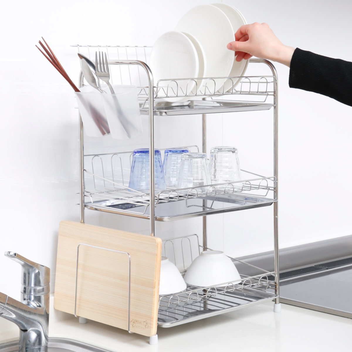 洗った食器類をまとめて乾燥・収納できる、大容量の3段水切りラックです。お皿とお椀、グラス類など分けて置くことで、乾いた後の片付けも楽ちんです。