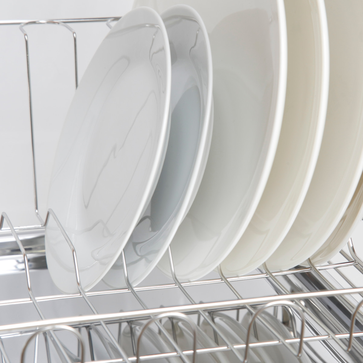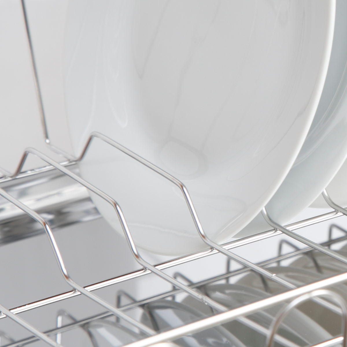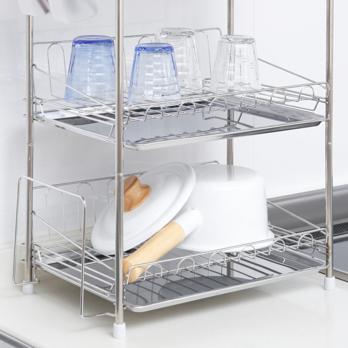 広々としたワイヤー間隔でお皿が並べやすく、空気に触れやすいので乾きが早いです。上段のワイヤーは立ち上がった形状でお皿をしっかり支えます。中段と下段はお茶碗やグラス類が置きやすいフラットな形状です。