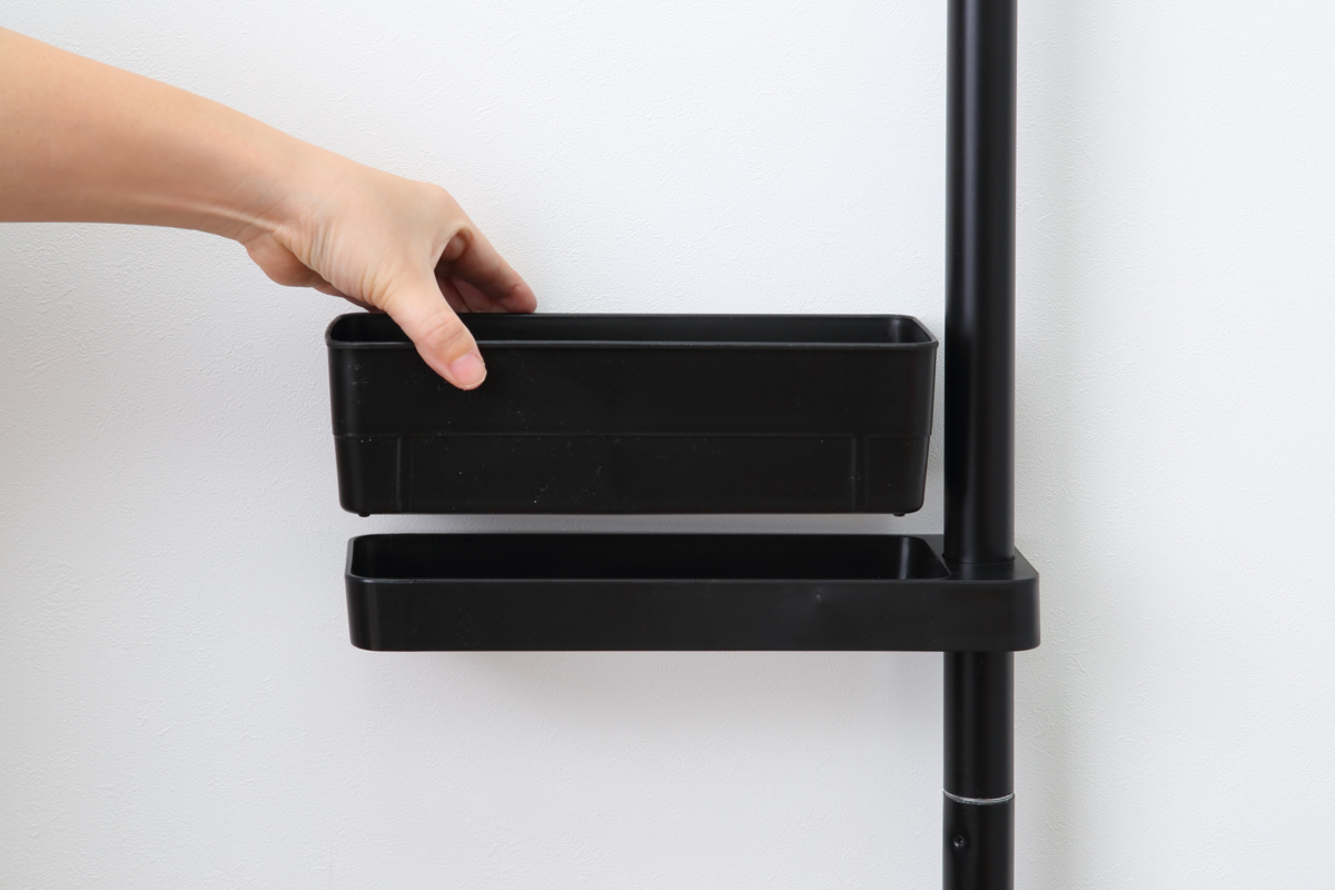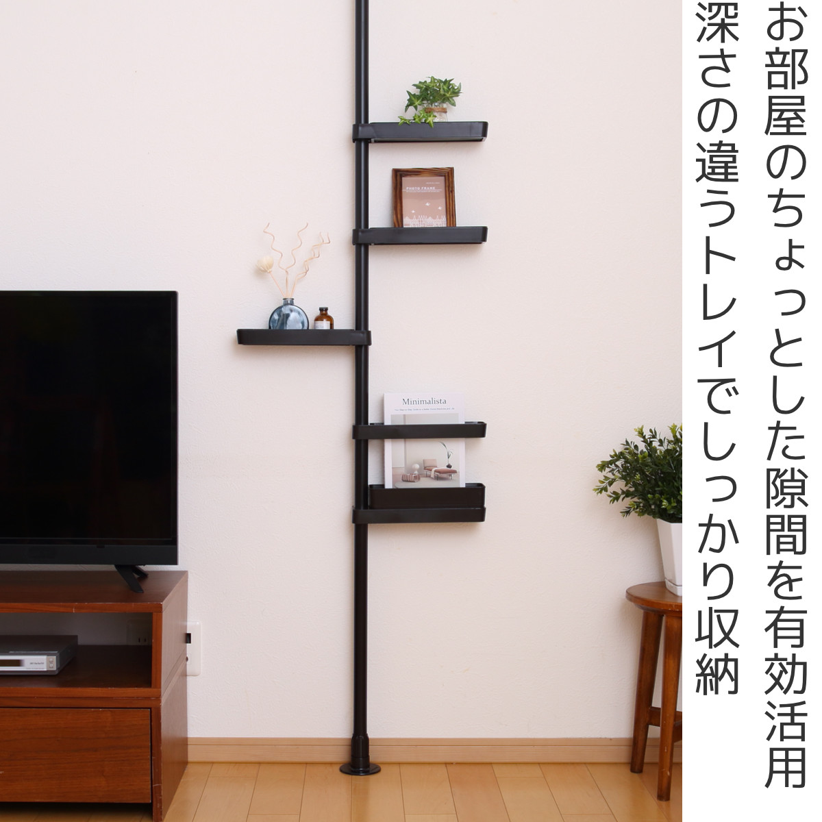突っ張り スリムラック 深型トレイ付き 高さ200~275cm ( 突っ張りラック スリム 収納 突っ張り棒 隙間収納 つっぱり ホワイト ブラック すき間 隙間 洗濯機 洗濯機横 洗面 キッチン トイレ 玄関 つっぱり棚 突っ張り棚 収納ラック ) 【ブラック】