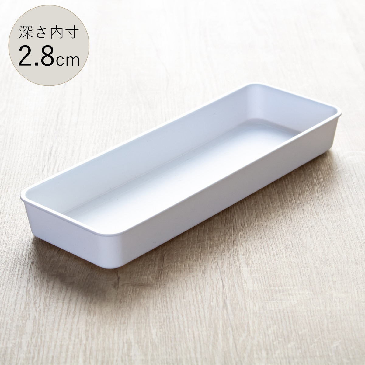 インナートレイは深さちがいで2種類。深さ2.8cmの浅型は、小さな物や背の低い物の収納に最適です。深さ7cmの深型は、倒れてしまいやすいボトルなどの収納にぴったり。用途に合わせてしっかり整理できます。