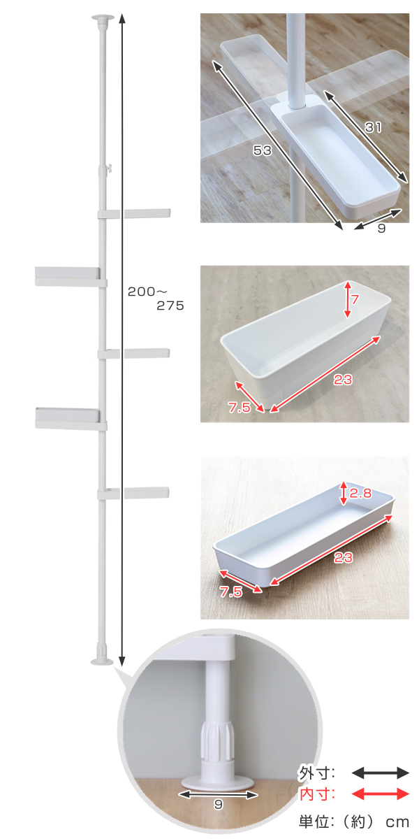 | サイズ | 約 幅9×奥行31×高さ200~275(cm) 圧着板:約 直径9(cm) 幅最大部展開時(トレイ):約 53(cm) |