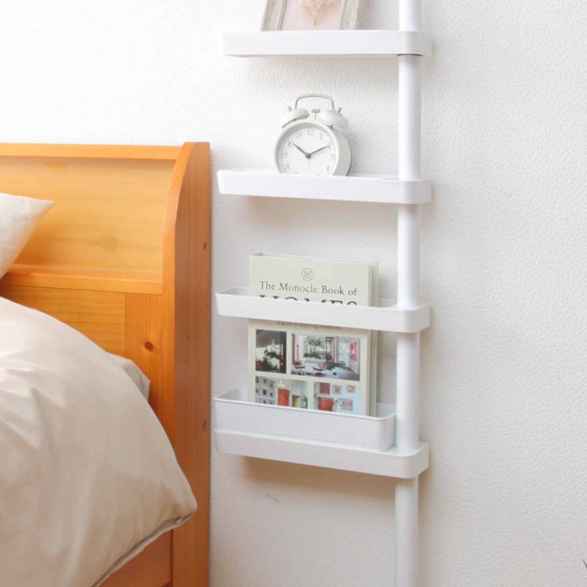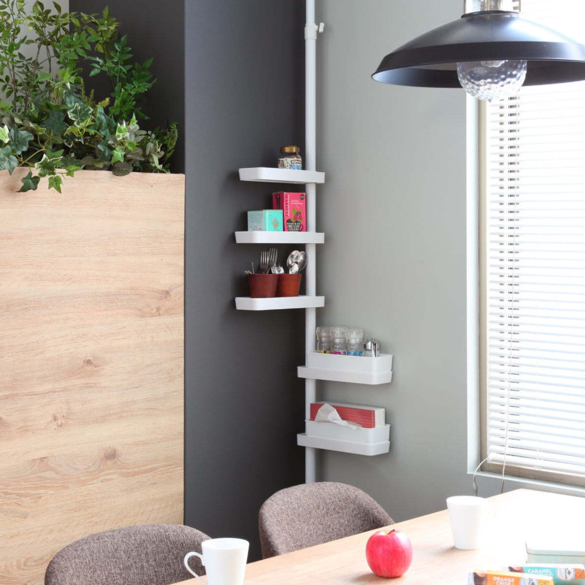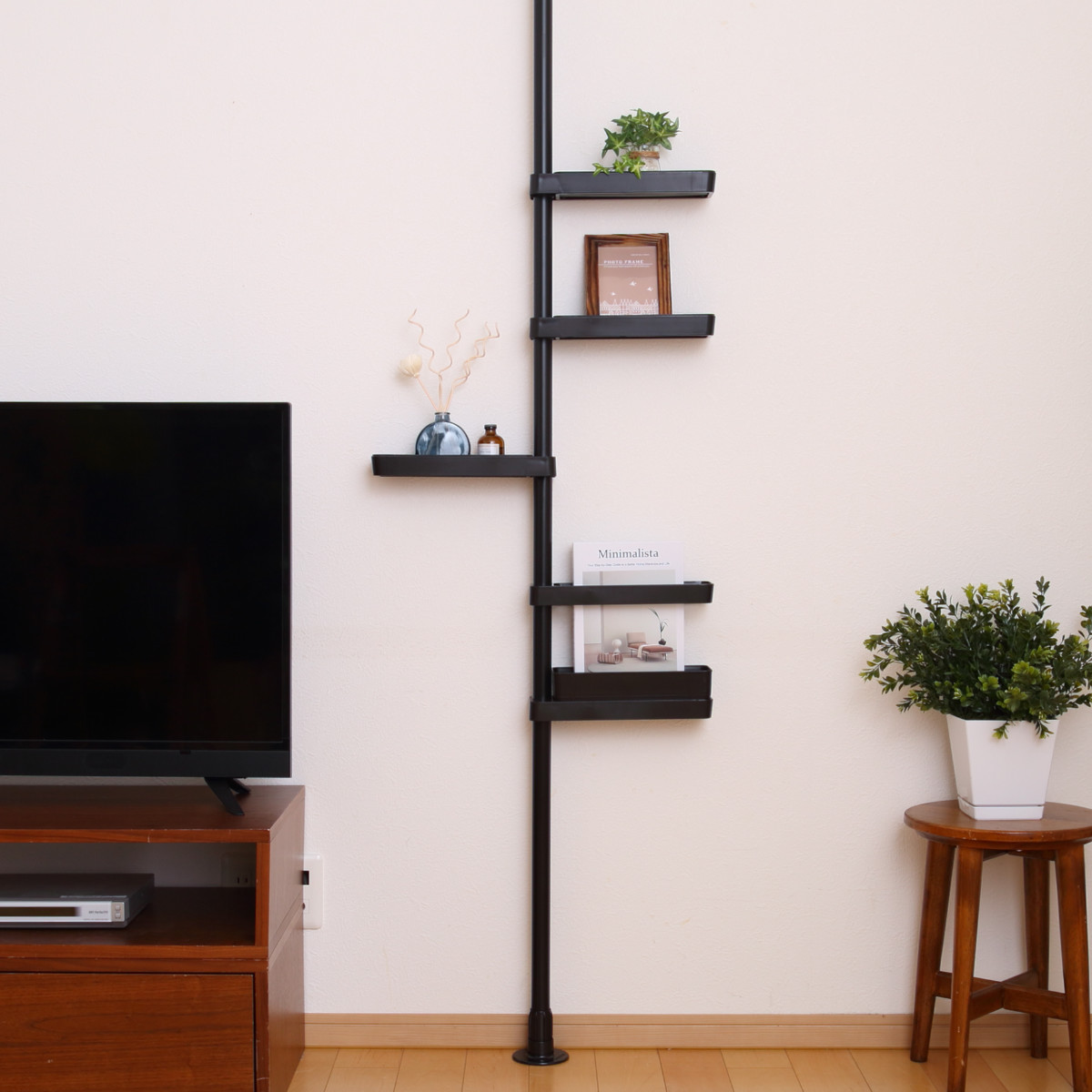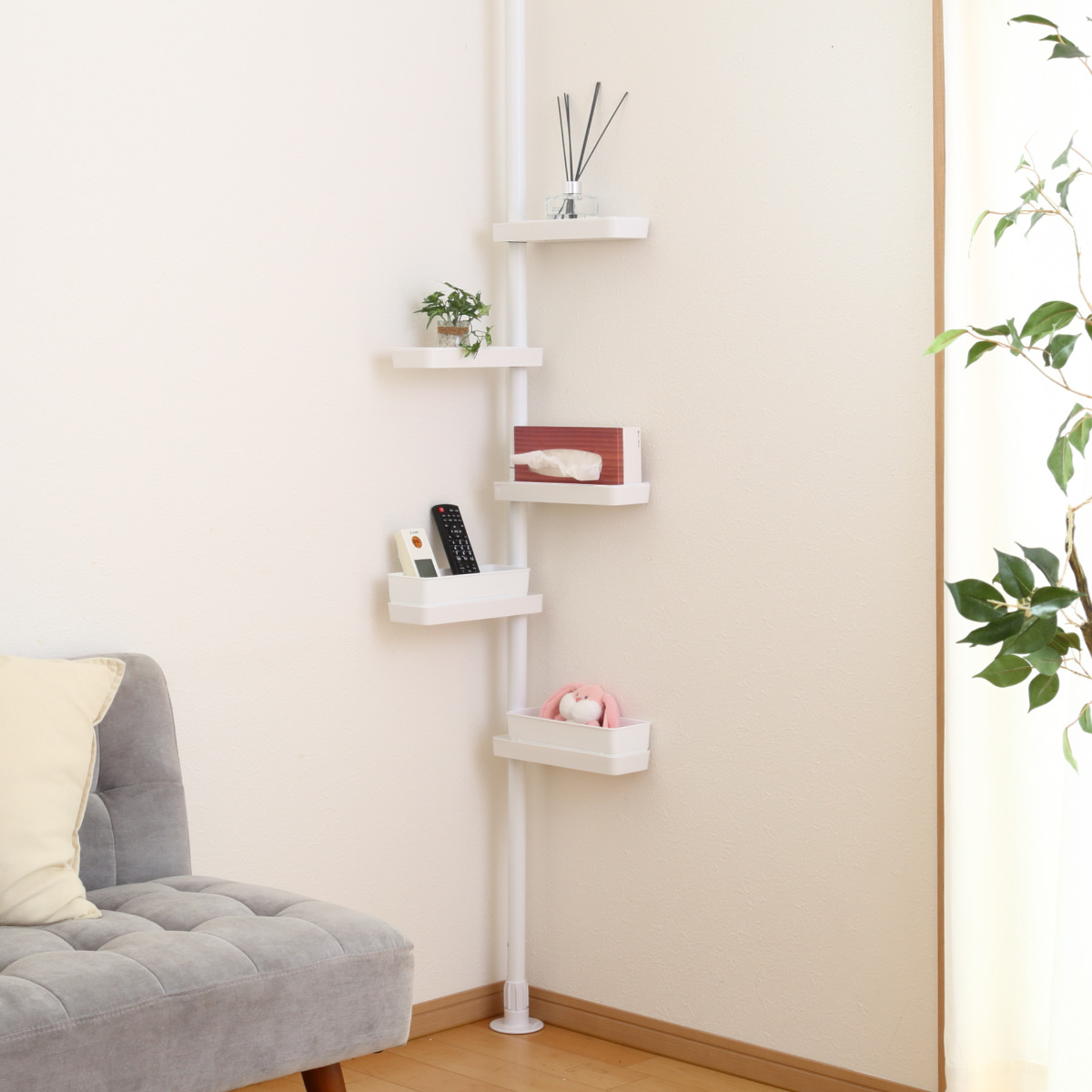 お部屋のちょっとした隙間やコーナーを有効活用できるスリムラックです。突っ張り仕様で設置に必要な床面積は9cm×9cm、わずかなスペースに収納スペースを増やすことができます。工事不要で手軽に設置できるので、賃貸住宅にお住まいの方にもおすすめです。