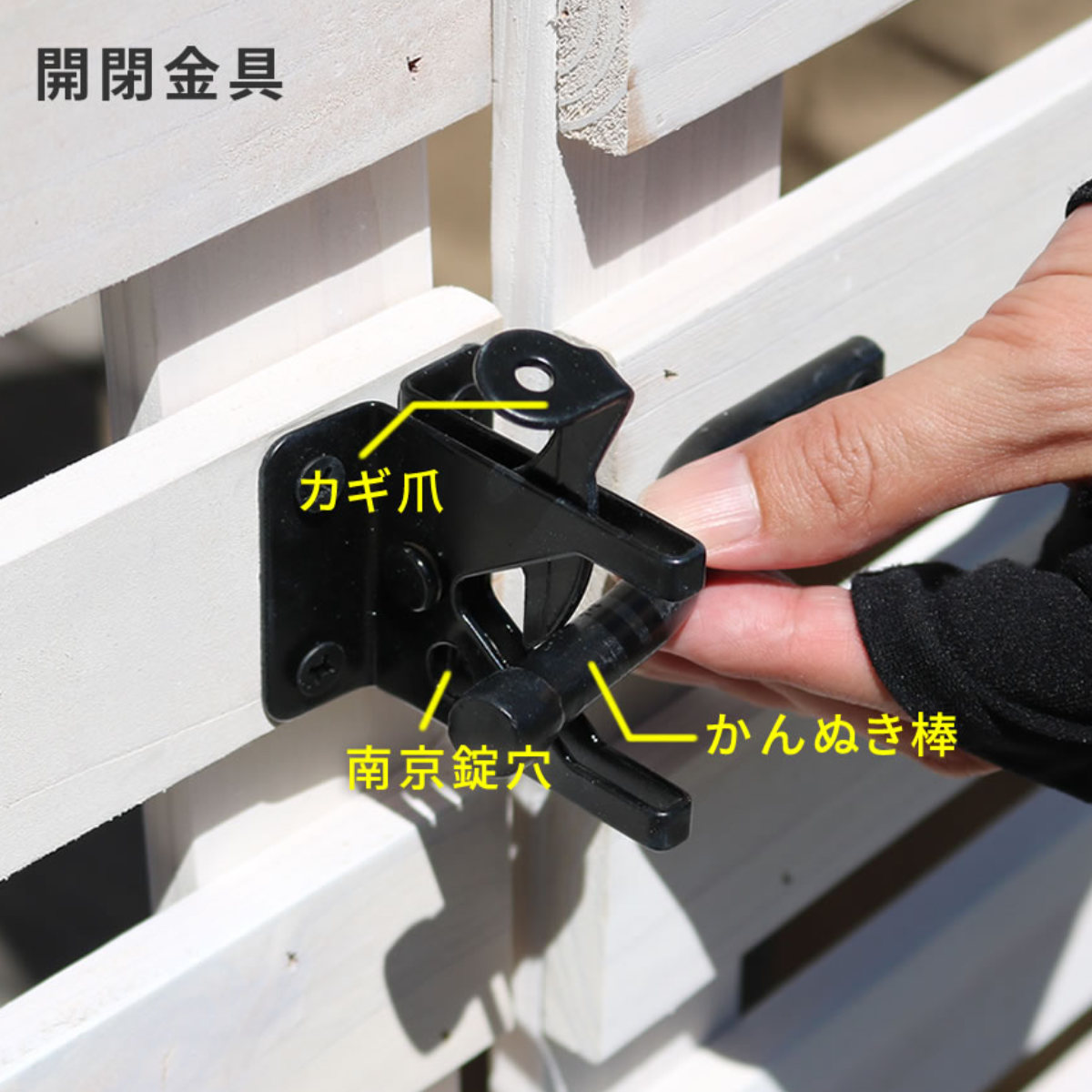 開閉金具付きでしっかり閉まるので、風でパタパタすることがありません。カギ爪が降りて、かんぬき棒をキャッチすることで、閉めることができます。