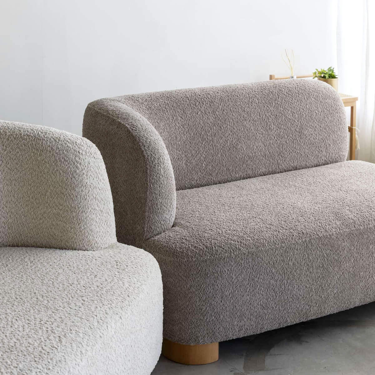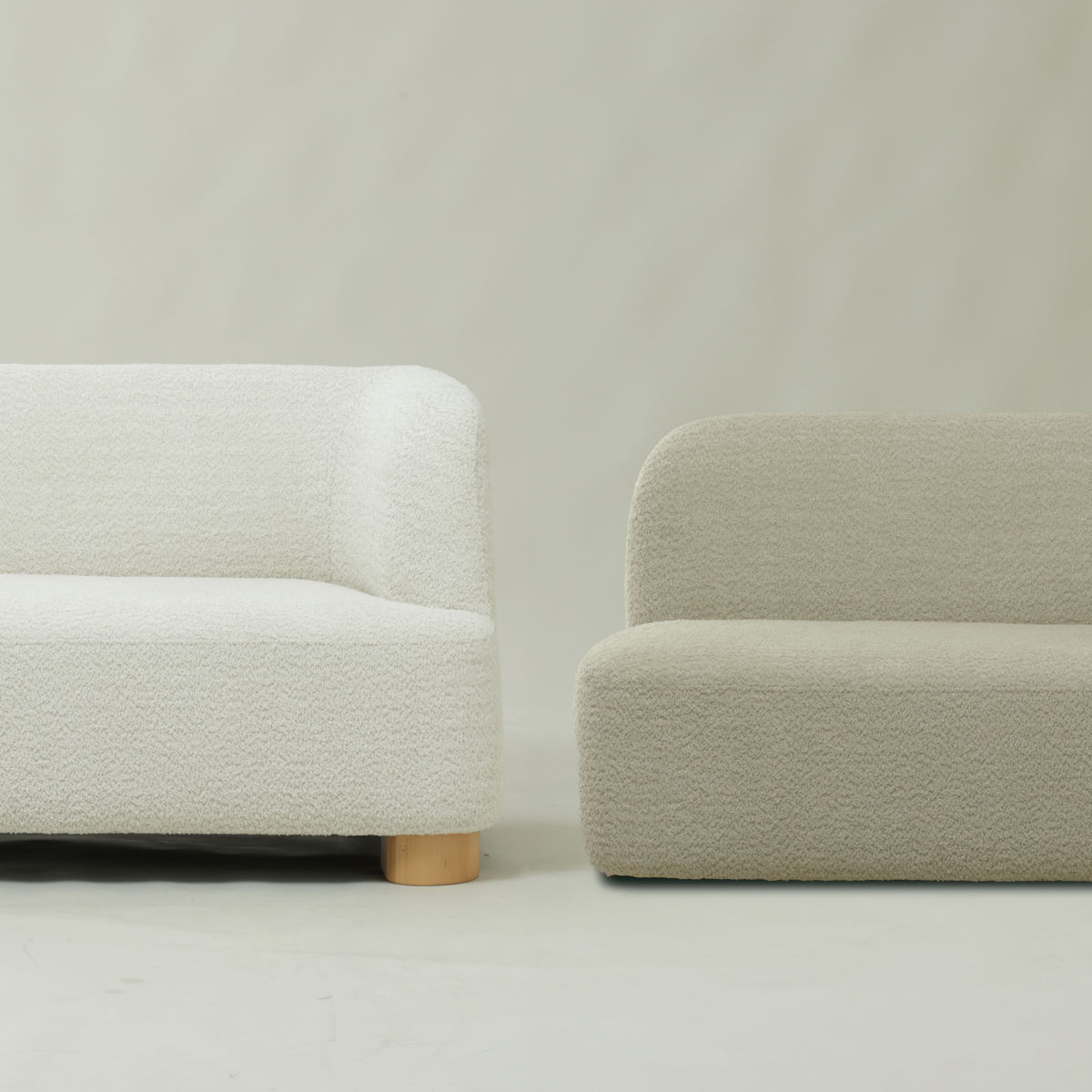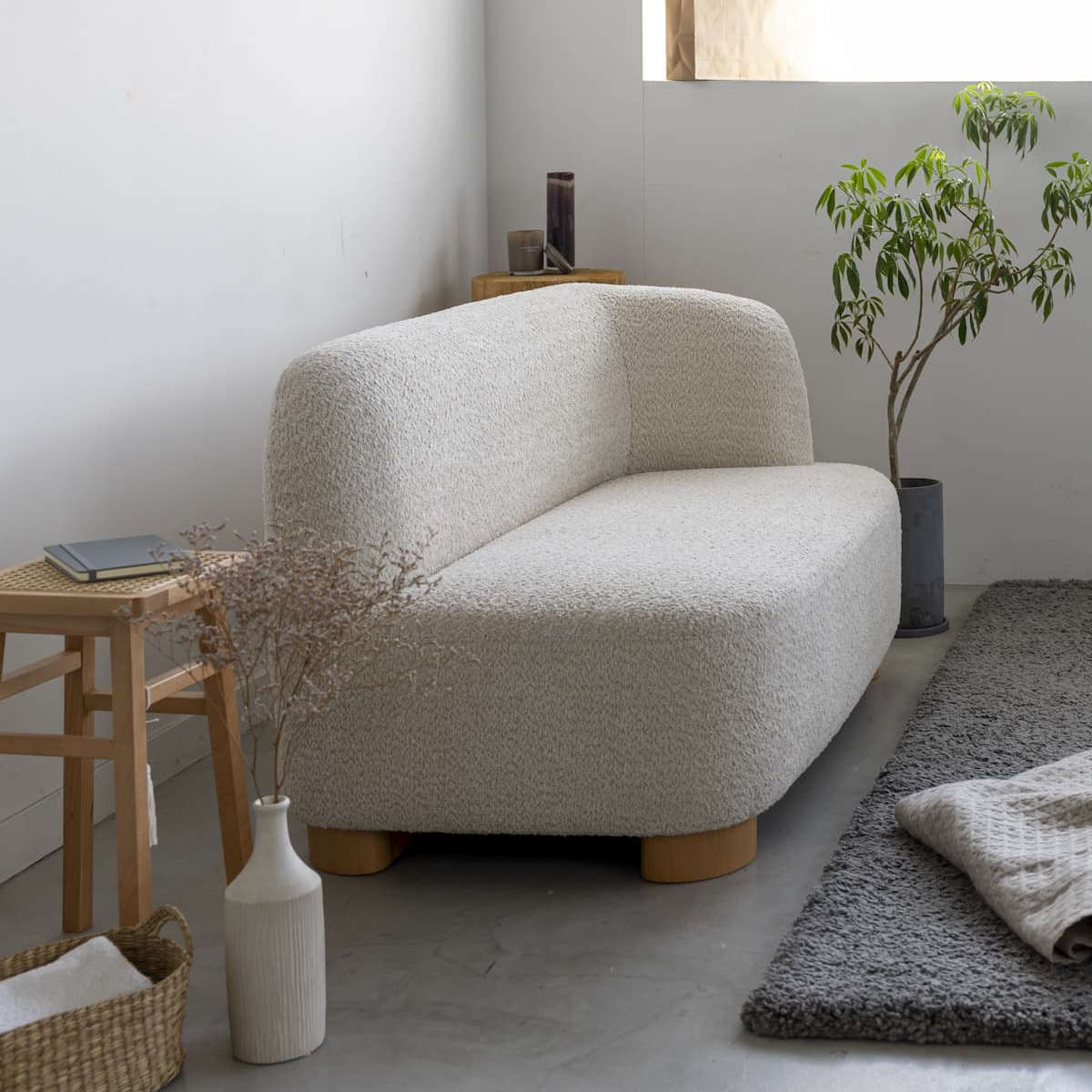 自然な丸みを描いたデザインが特徴的で、淡く、儚げでアンニュイな雰囲気のあるアームソファ。リビングやプライベート空間に自然に溶け込みます。背から丸みを帯びて延びたひじ掛けは、右肘と左肘仕様の2タイプからお選びいただけます。