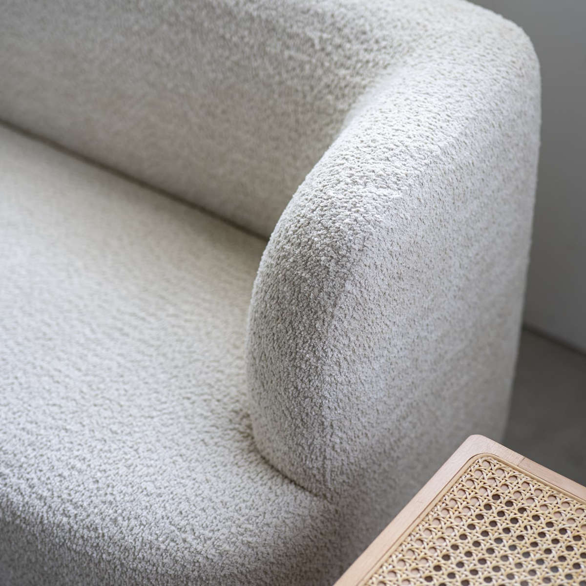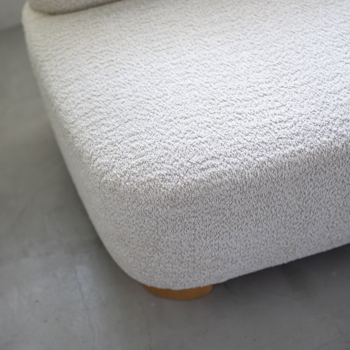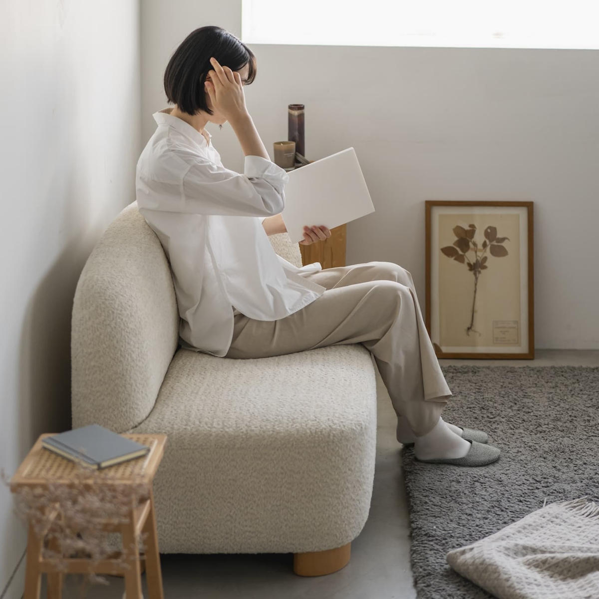自然な丸みを描いたデザインが特徴的で、淡く、儚げでアンニュイな雰囲気のあるアームソファ。リビングやプライベート空間に自然に溶け込みます。背から丸みを帯びて延びたひじ掛けは、右肘と左肘仕様の2タイプからお選びいただけます。