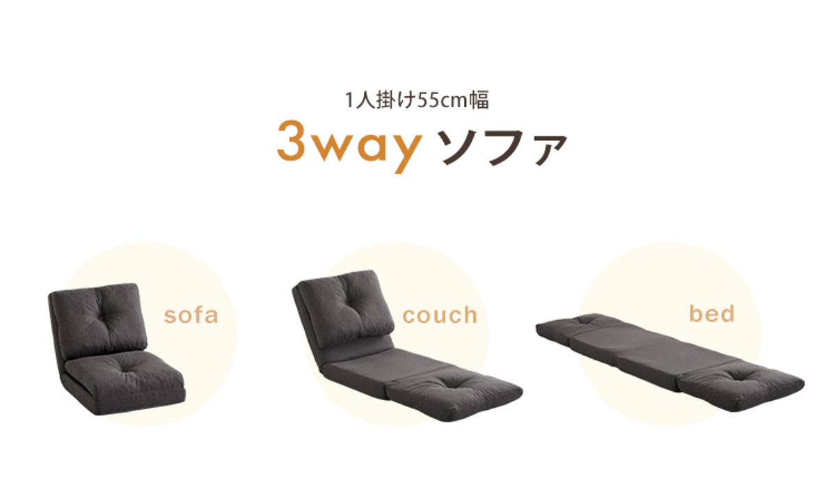 ![]() 3wayソファ 1人掛け 幅55cm | ![]() 3wayソファ 1.5人掛け 幅80cm | ![]() 3wayソファ 2人掛け 幅110cm |