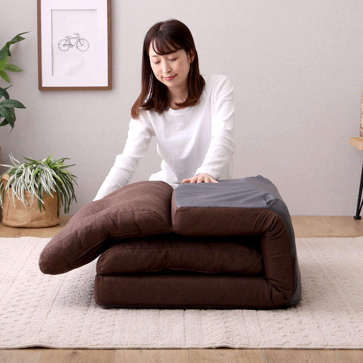 生地にはさらりとしたファブリック生地を使用。夏はサラっと涼しく、冬は温かみのある生地で、季節を問わず快適に使えます。