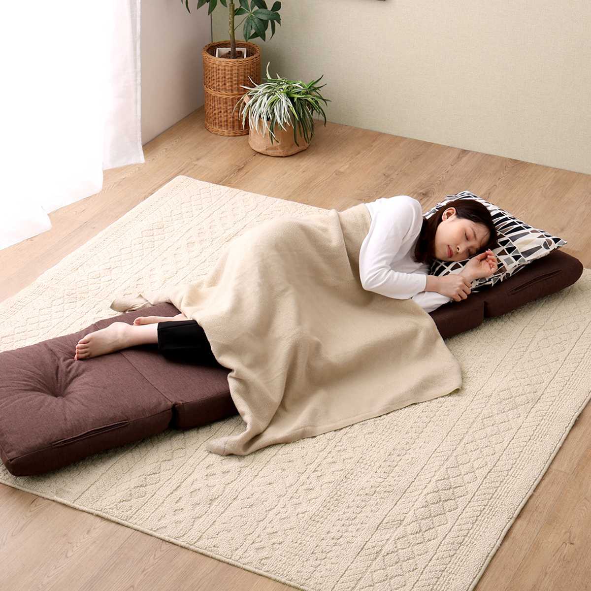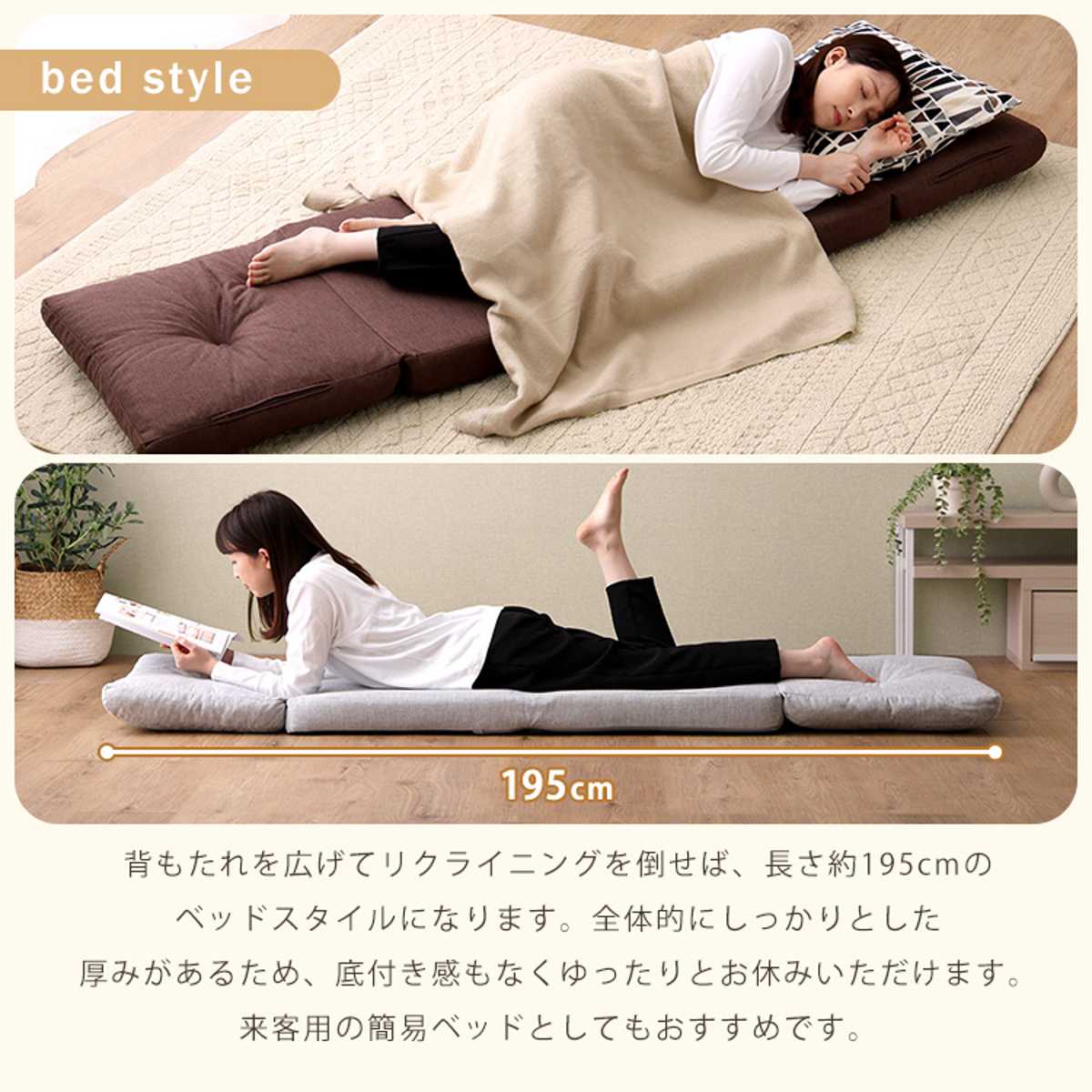 背もたれを広げてリクライニングを倒せば、長さ約195cmのベッドスタイルになります。全体的にしっかりとした厚みがあるため、底付き感もなくゆったりと休めます。来客用の簡易ベッドとしてもおすすめです。