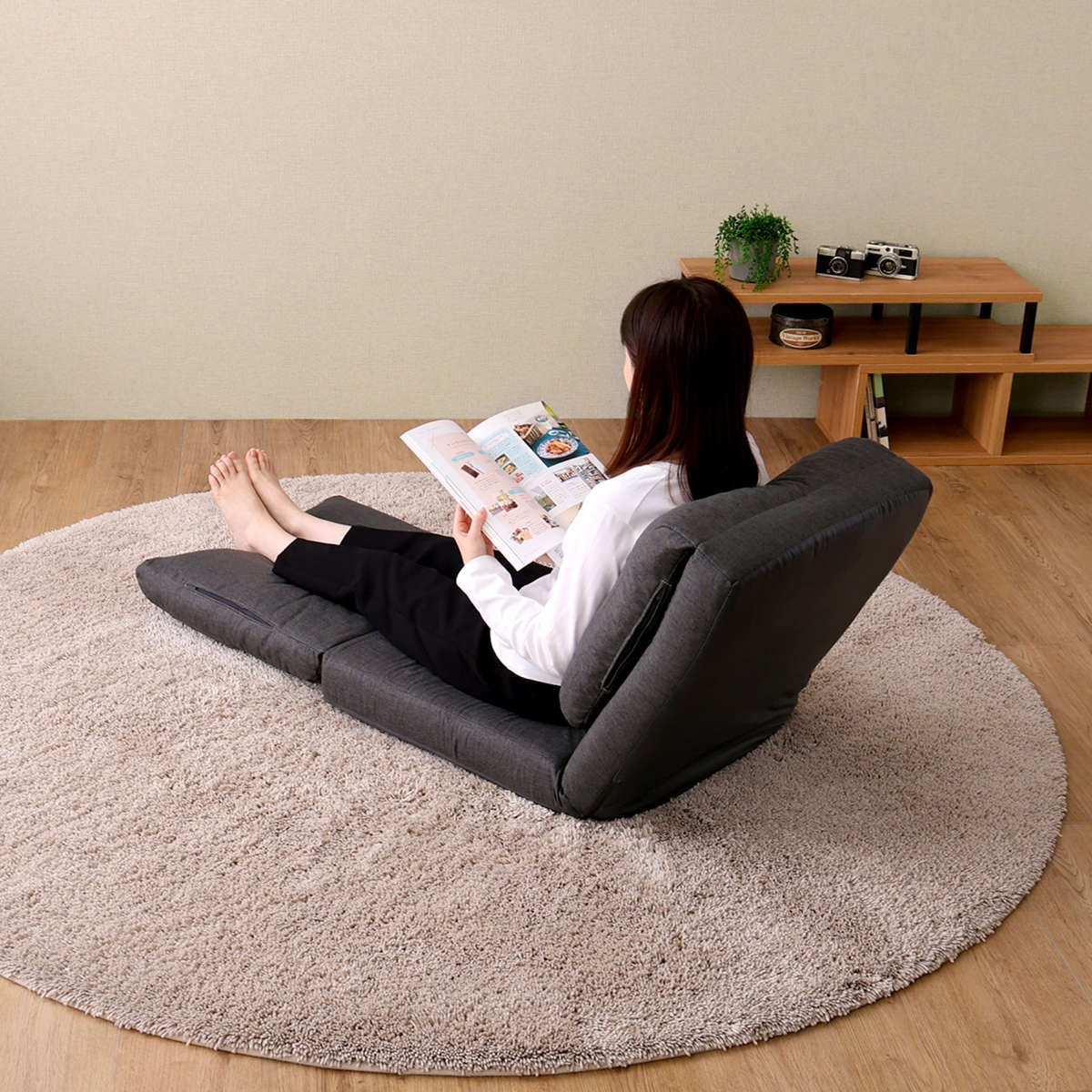 座面を広げると足元ひろびろのカウチソファに様変わり。背もたれの角度を細かく調節できるので、読書や映画鑑賞などさまざまなシーンで使えます。