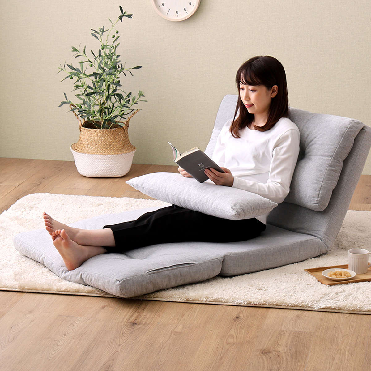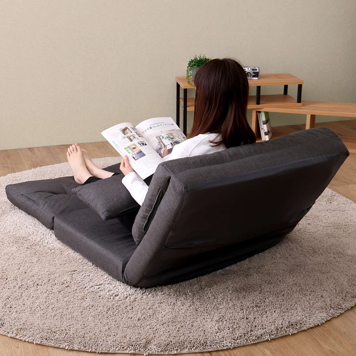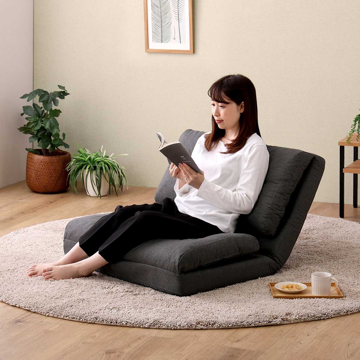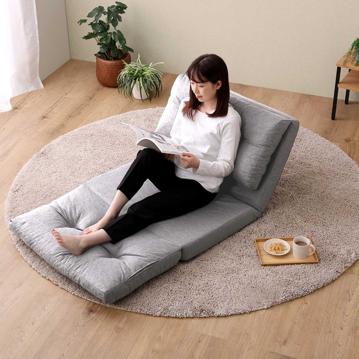 座面を広げると足元ひろびろのカウチソファに様変わり。背もたれの角度を細かく調節できるので、読書や映画鑑賞などさまざまなシーンで使えます。