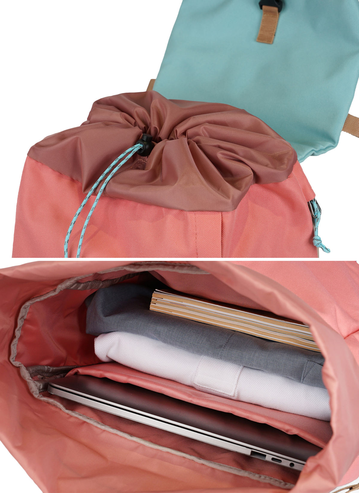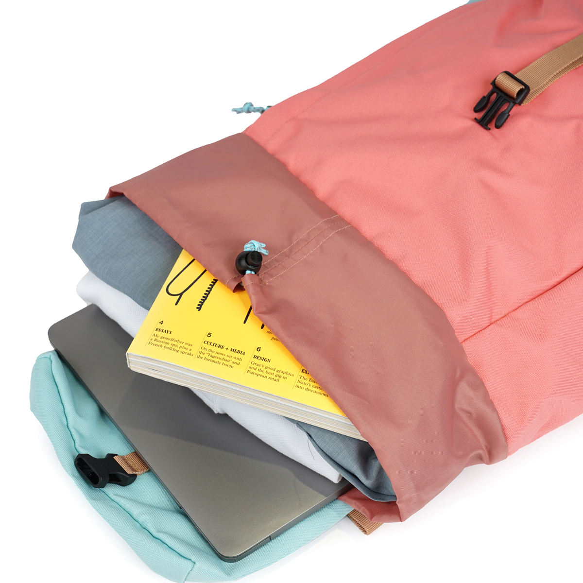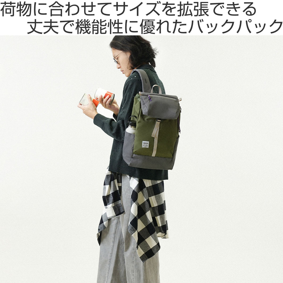 拡張して使えるロールトップデザインなので、荷物の量に合わせてリュックのサイズを調整できます。外出先で急に荷物が増えても簡単に拡張できます。