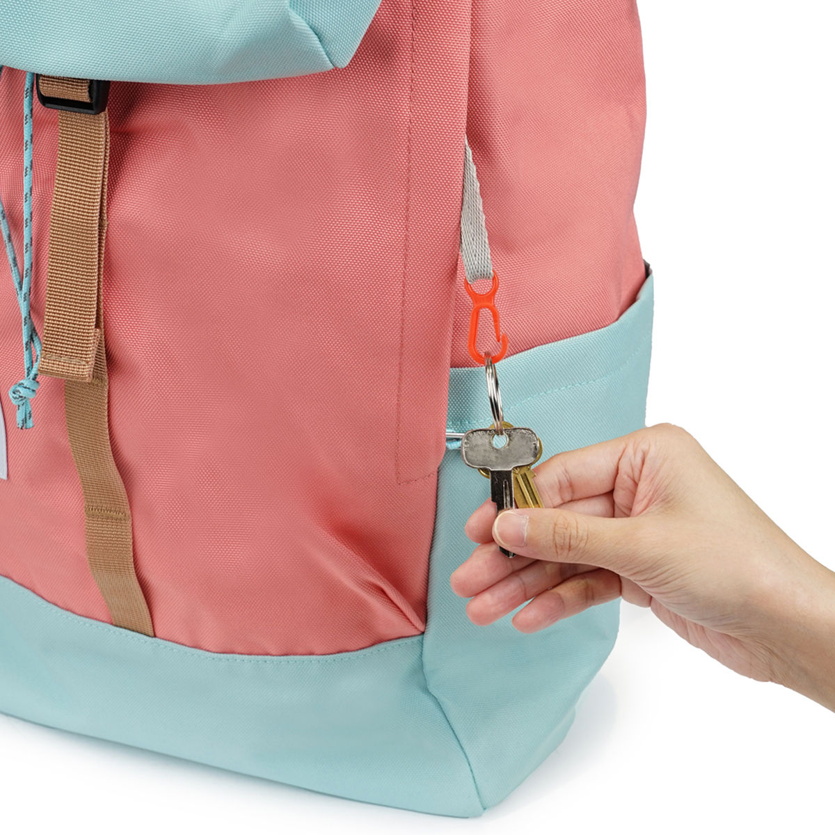 前面にも大きなファスナーポケットが付いています。内側にはキークリップ付きで、鍵やイヤホンケースなどを引っ掛けられます。