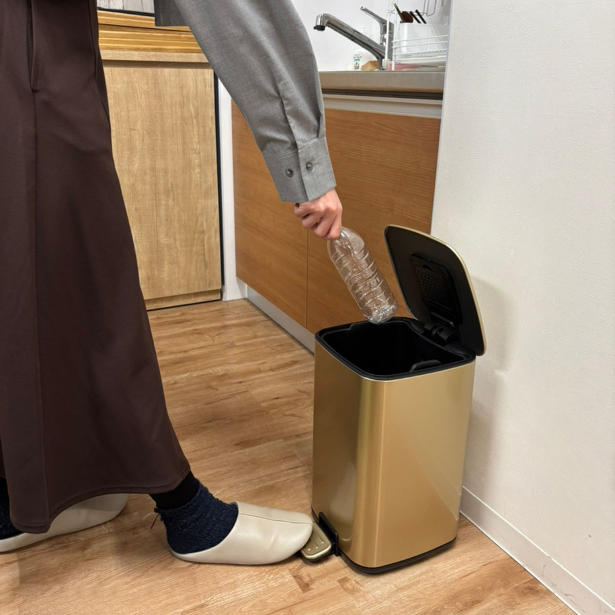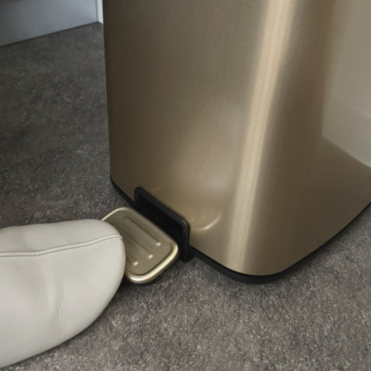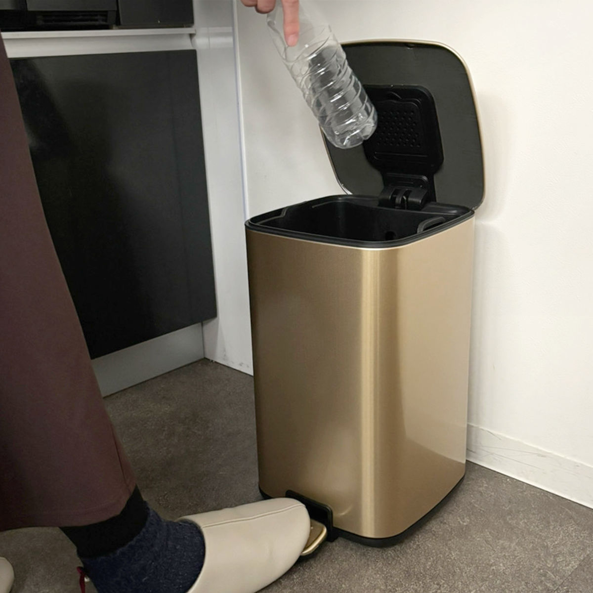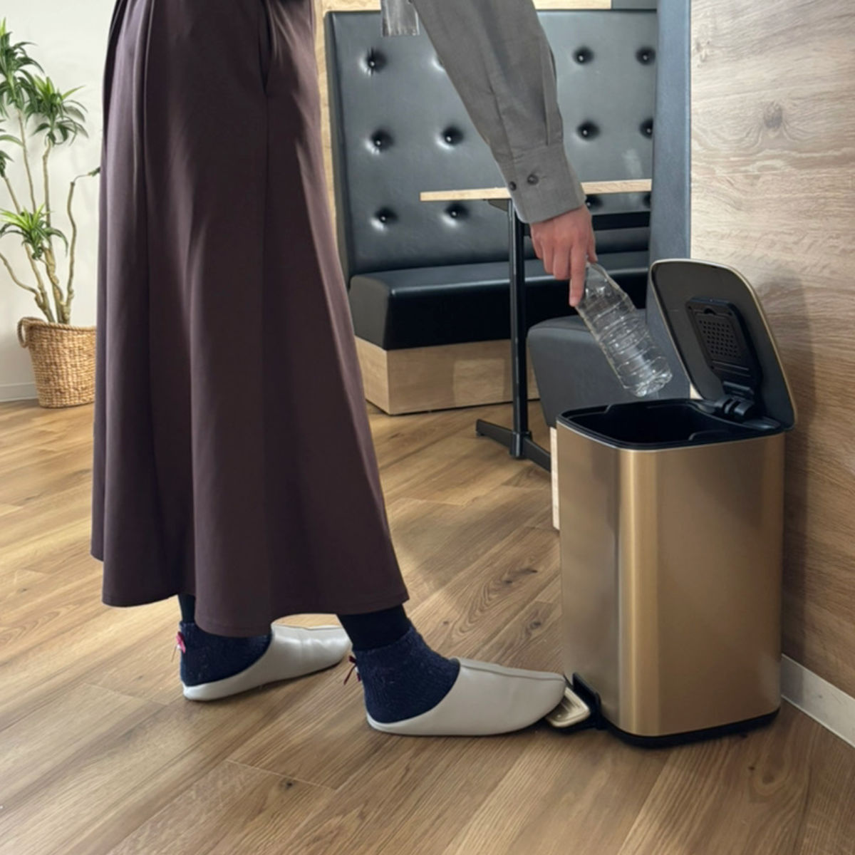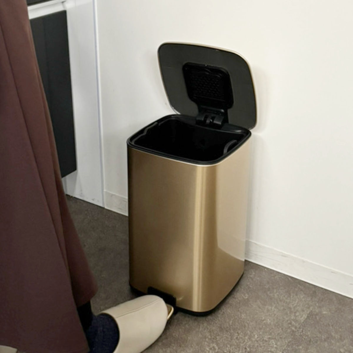 思わず見せたくなるお洒落な外観、来客時はもちろん、毎日目にする場所に置いても、生活感を気にせずお使いいただけます。ペダル式の容量12Lで、キッチンやお部屋でも使いやすいサイズです。