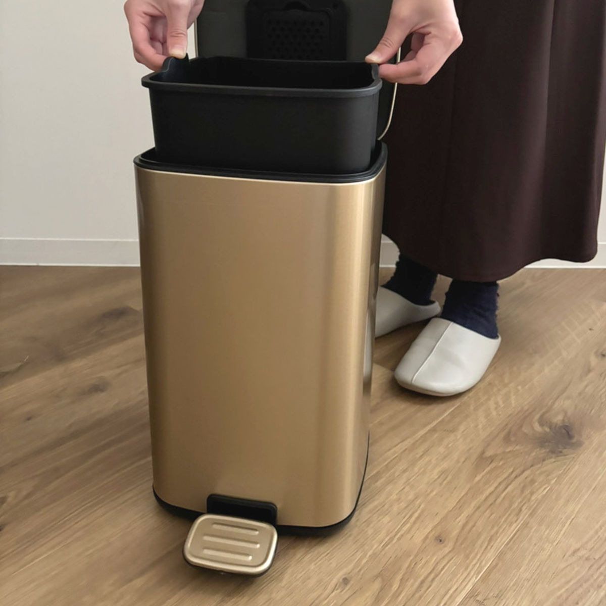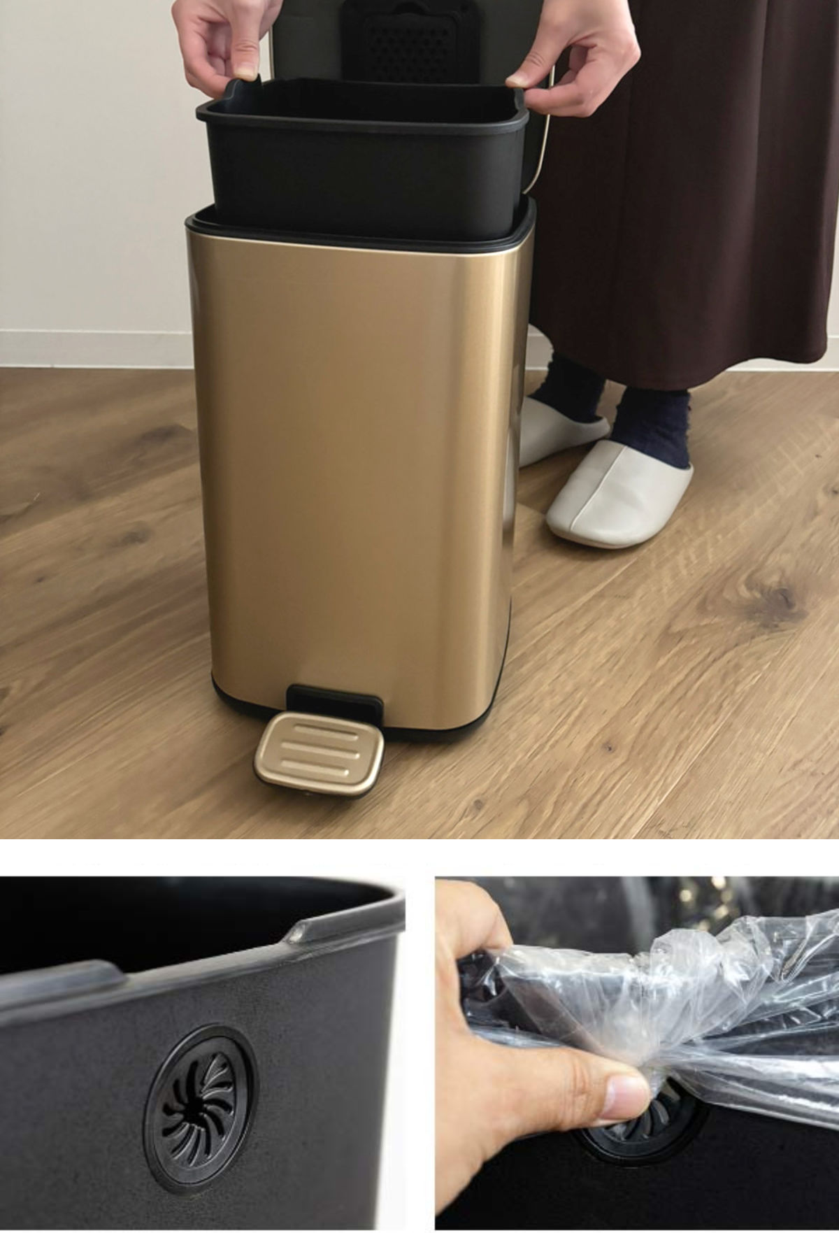 外側のカバーと内側のボックスが分かれているので、袋が外側から見えないため、見た目もすっきりと美しくお使いいただけます。インナーボックスには、ホルダー付きでゴミ袋がぴったりセットできます。