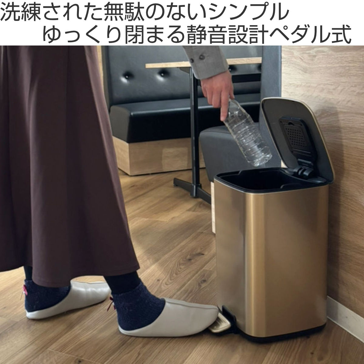 足で軽く踏むだけでサッと開くペダル式ゴミ箱です。手がふさがっていたり汚れている時でもフタを開けられるため、衛生的でとても便利です。ふたは、ソフトダンパー機能でゆっくり閉まる静音設計です。