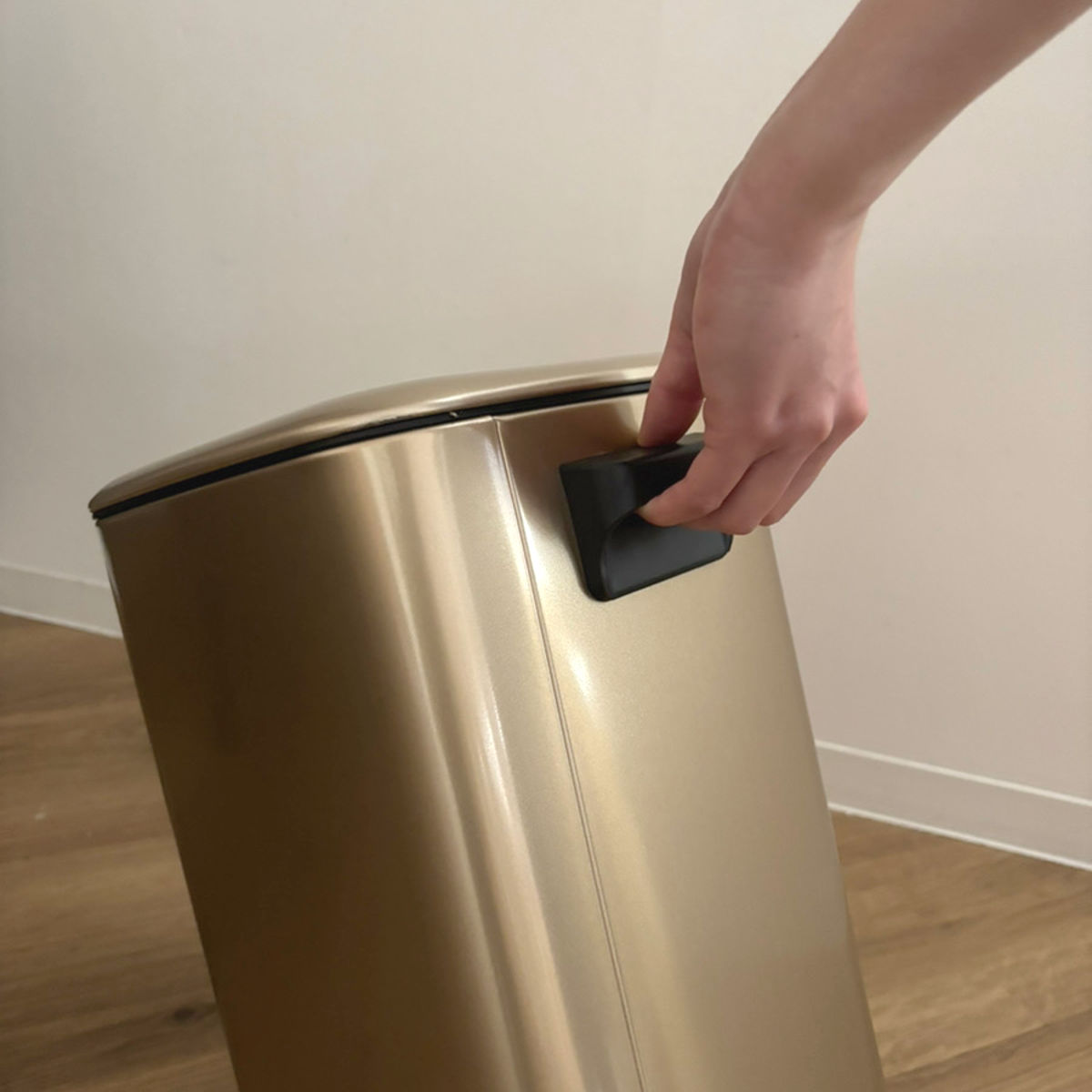ゴミ箱の背面には移動や掃除の際に便利な取っ手が付いています。12Lとコンパクトサイズなので片手でラクに持ち運べます。