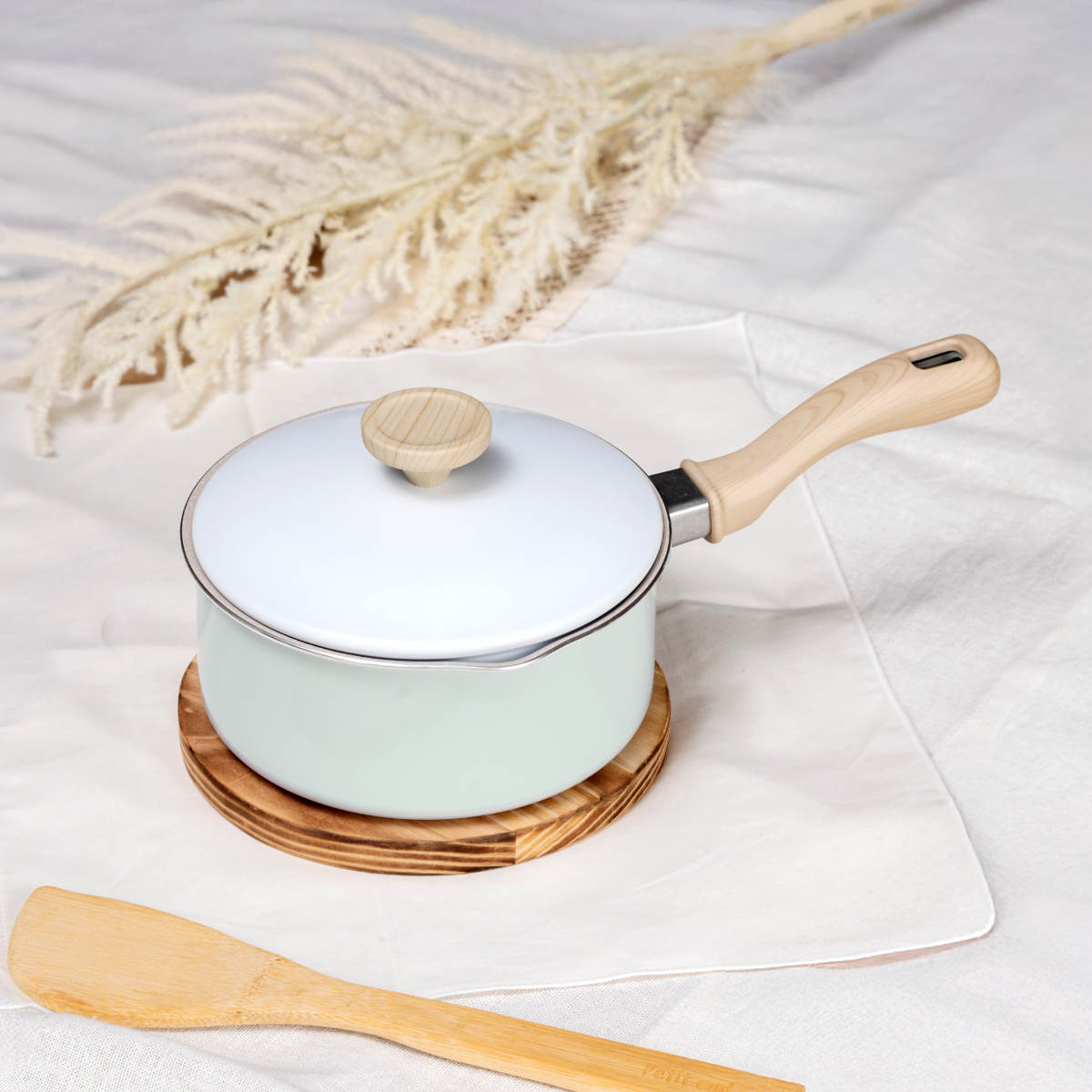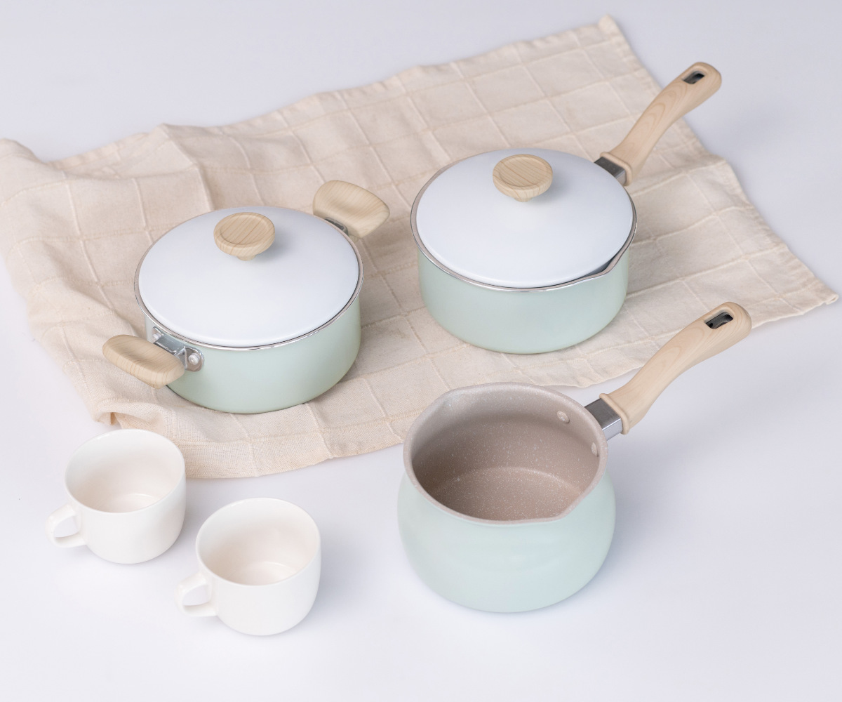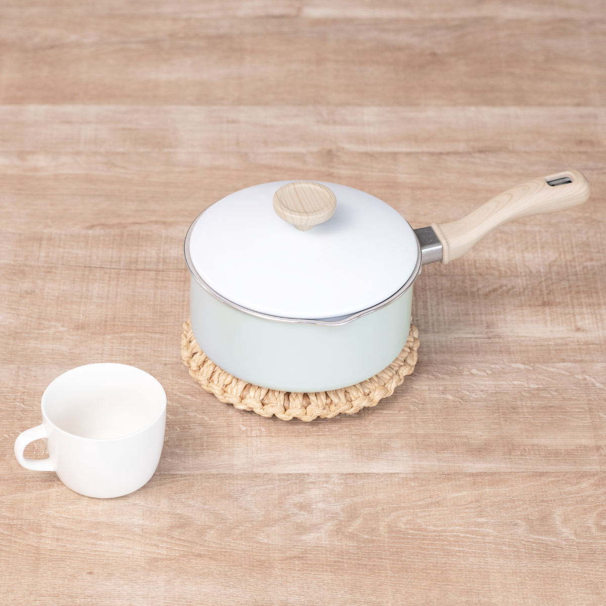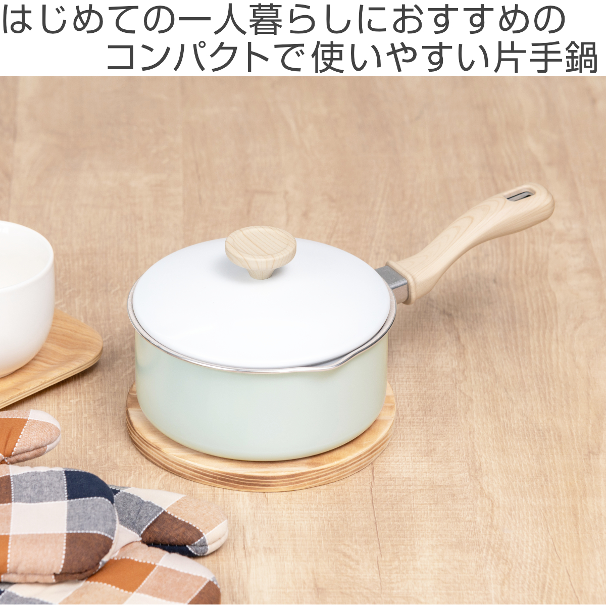 ホワイト×ミントグリーンの明るい雰囲気で温もりある木目調のハンドル。食卓に馴染む可愛いデザインなので、そのままテーブルに出して温かいお料理を楽しめます。