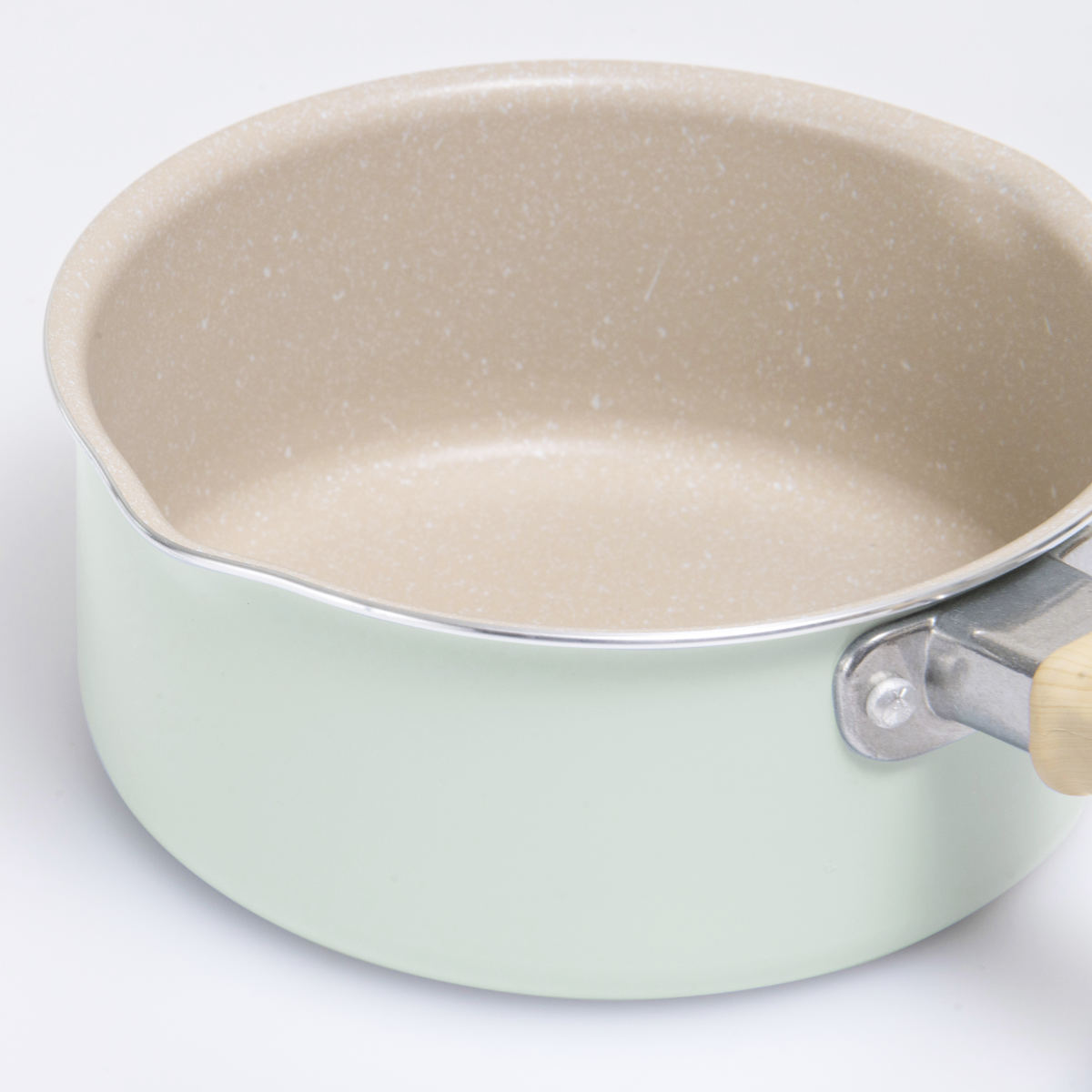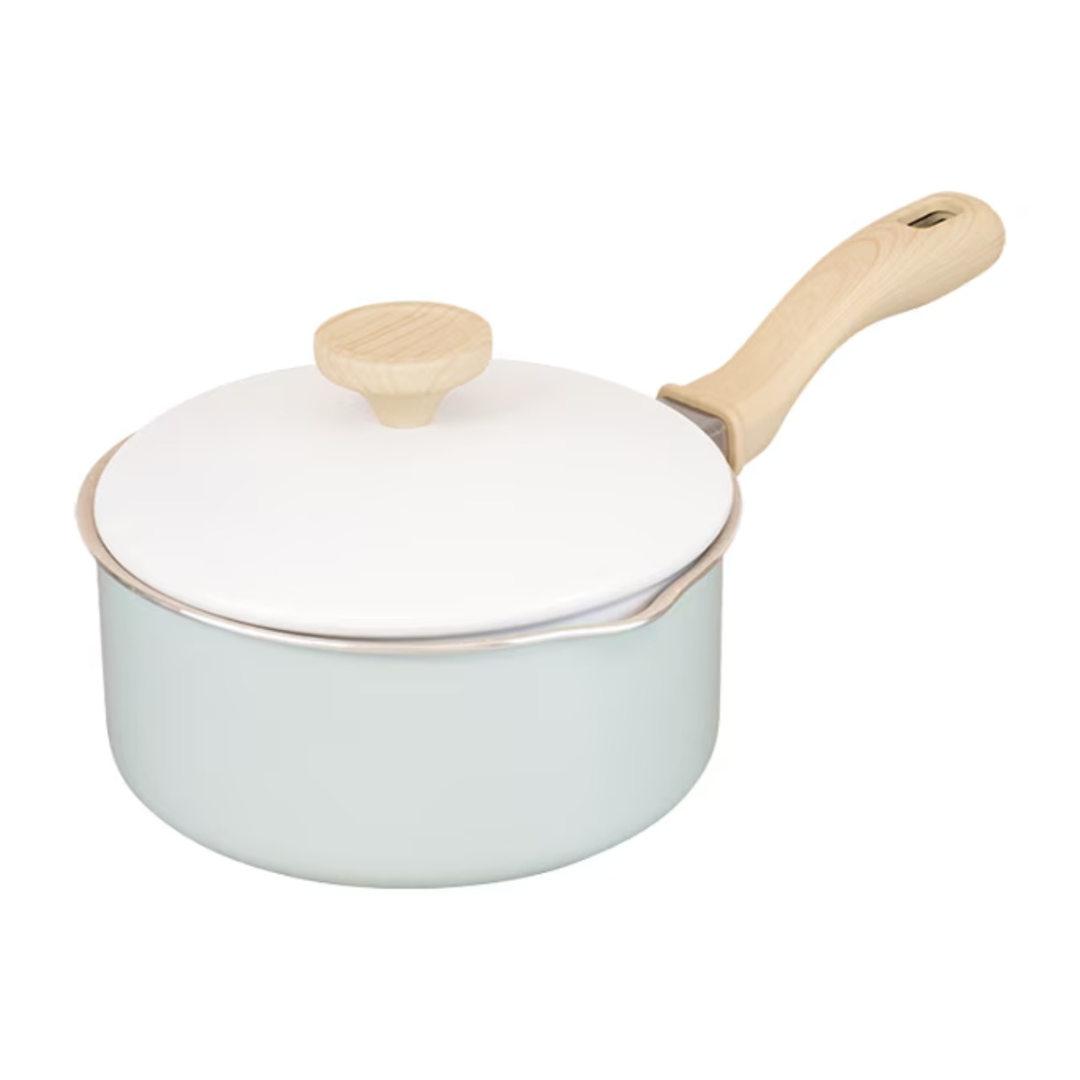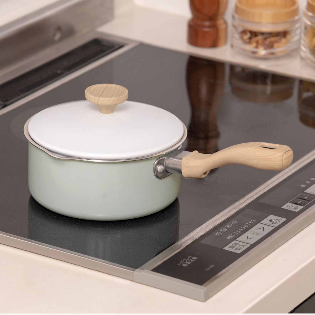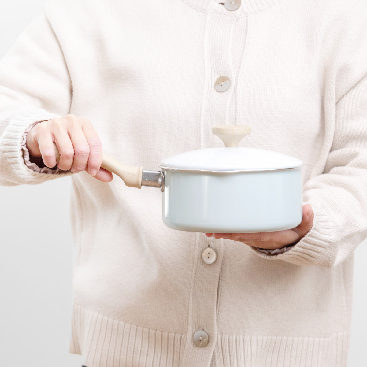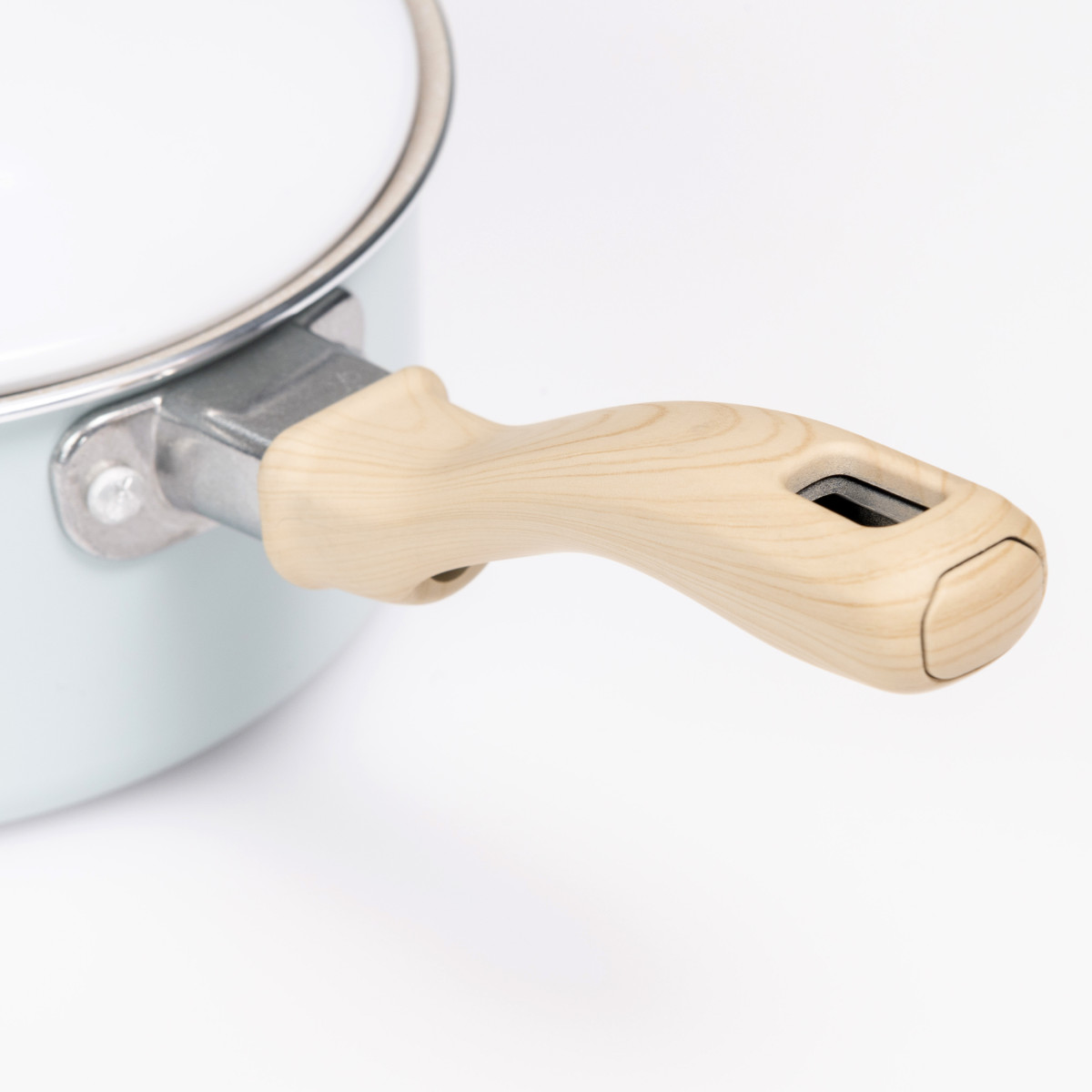 ホワイト×ミントグリーンの明るい雰囲気で温もりある木目調のハンドル。食卓に馴染む可愛いデザインなので、そのままテーブルに出して温かいお料理を楽しめます。