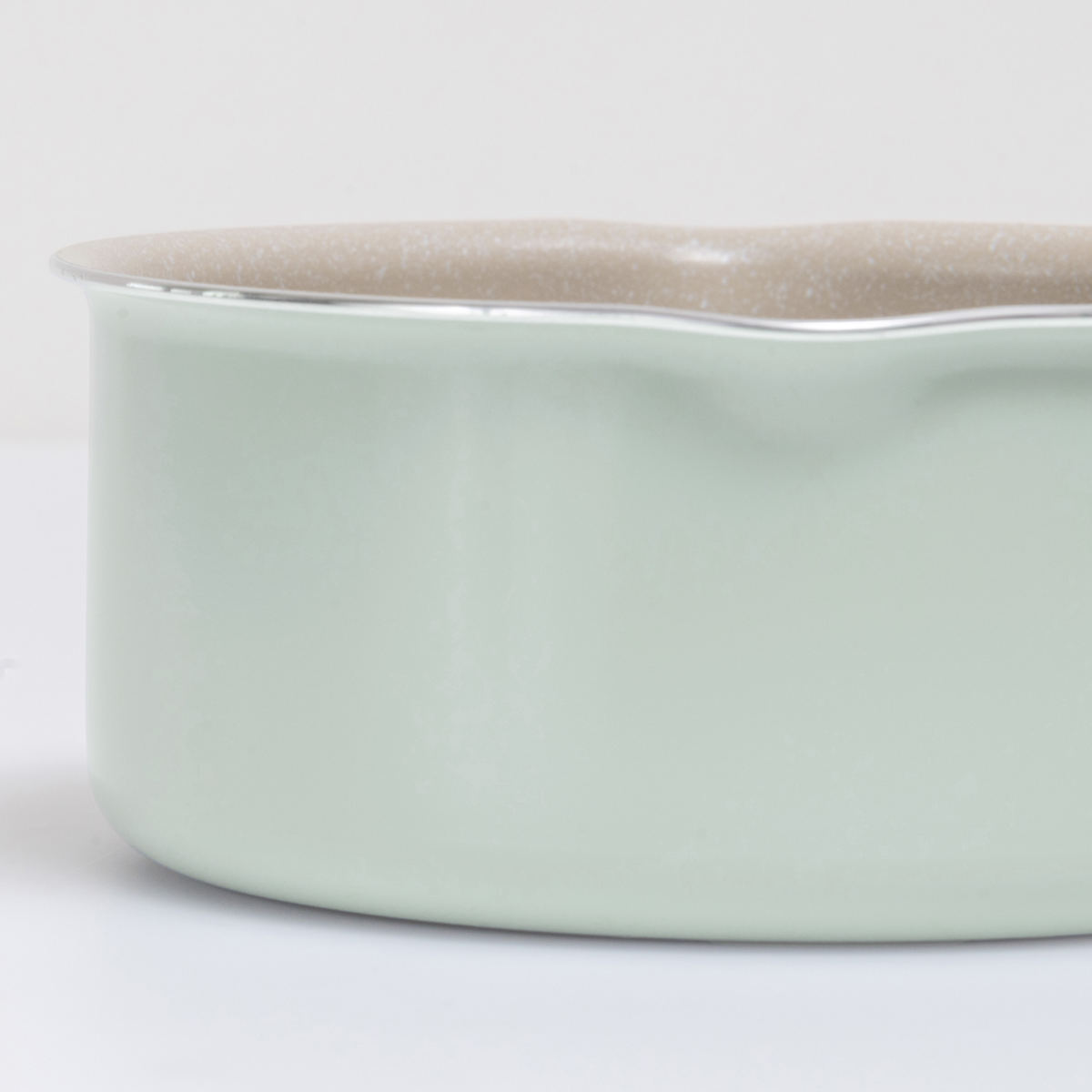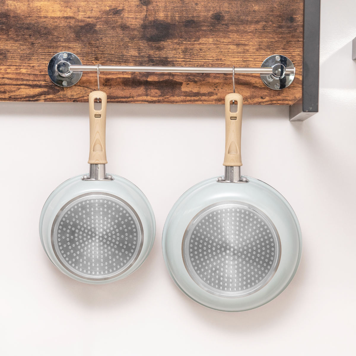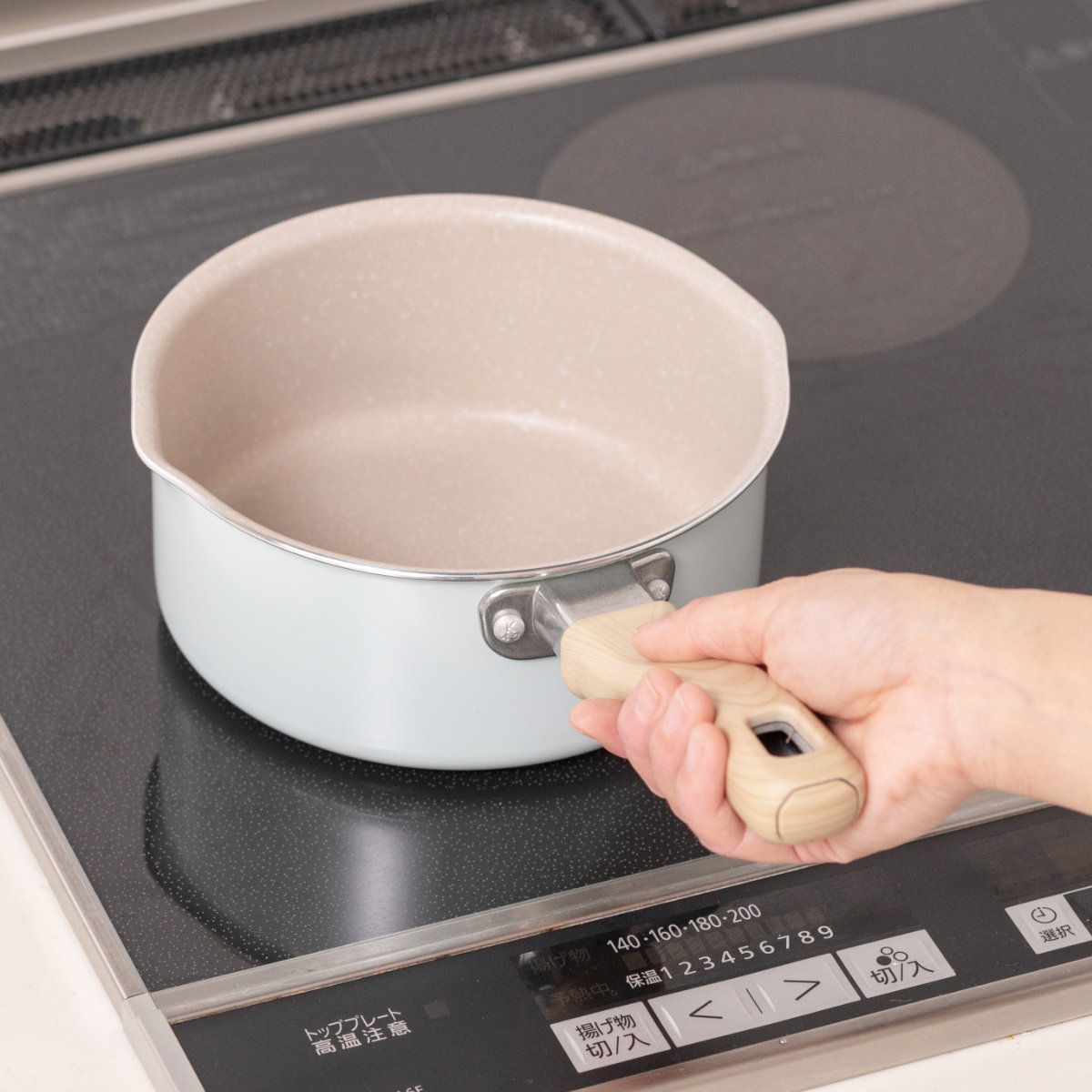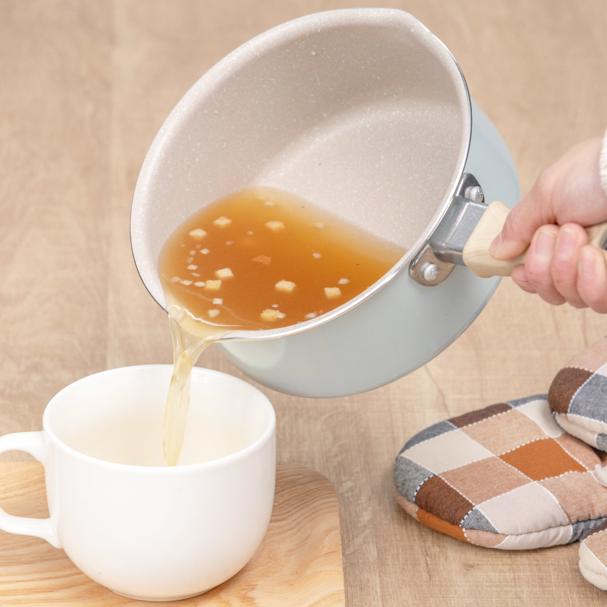 ホワイト×ミントグリーンの明るい雰囲気で温もりある木目調のハンドル。食卓に馴染む可愛いデザインなので、そのままテーブルに出して温かいお料理を楽しめます。