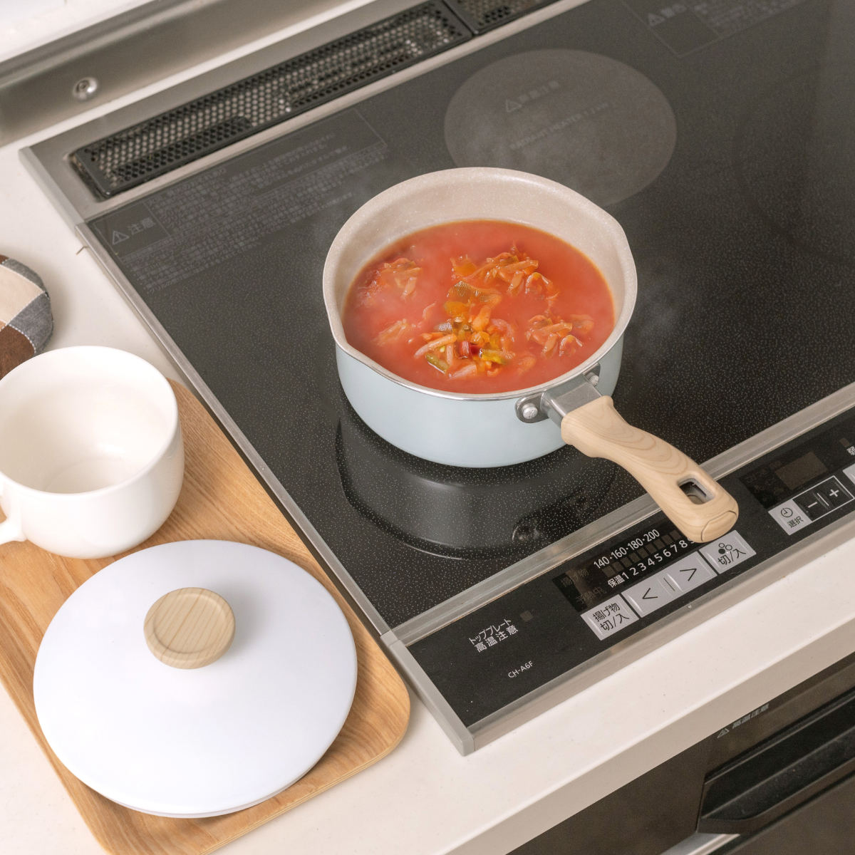 蓋付きなので、茹でたり煮たりするときに加熱効率がアップし、食材への火の通りが良くなり、沸騰までの時間も早くなります。また冷めにくくなるので、鍋に残った料理を保存するときにも便利です。