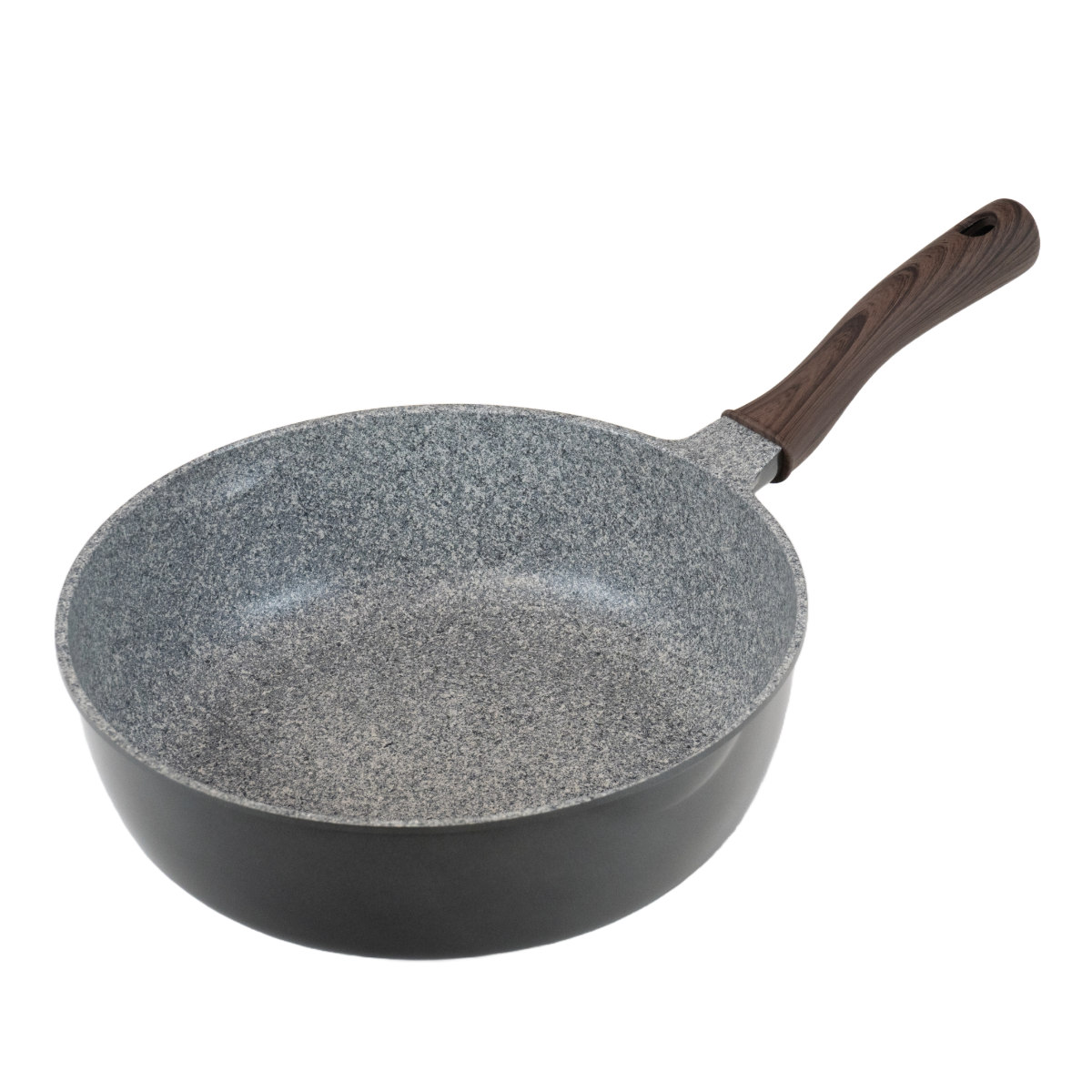 焼く、炒める、茹でる、煮る、揚げる、ができる、深型のフライパンです。内面はグレーのマーブル柄がシックで、ブラック×木目が落ち着いた雰囲気なので、そのまま食卓へ出してもお料理を引き立ててくれます。
