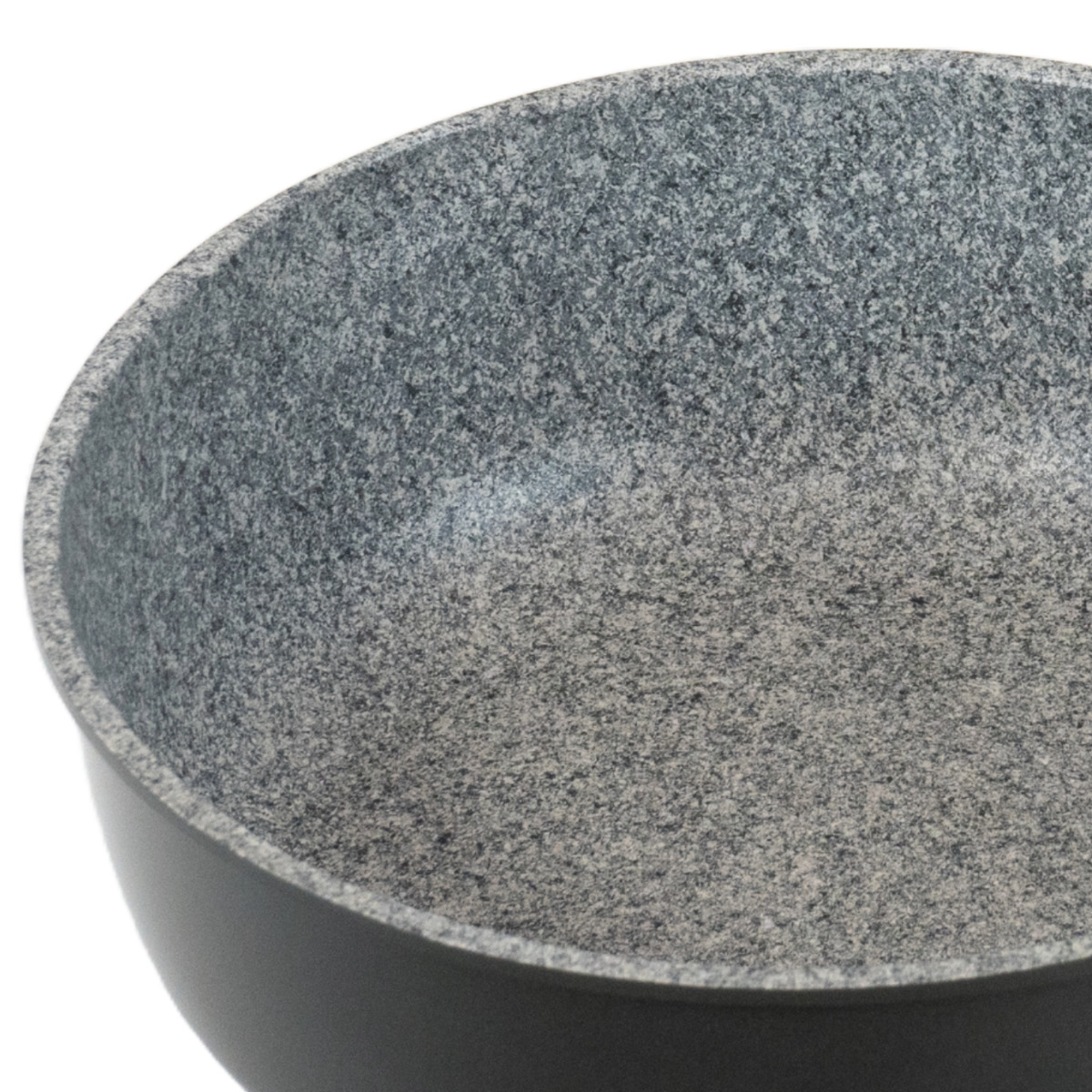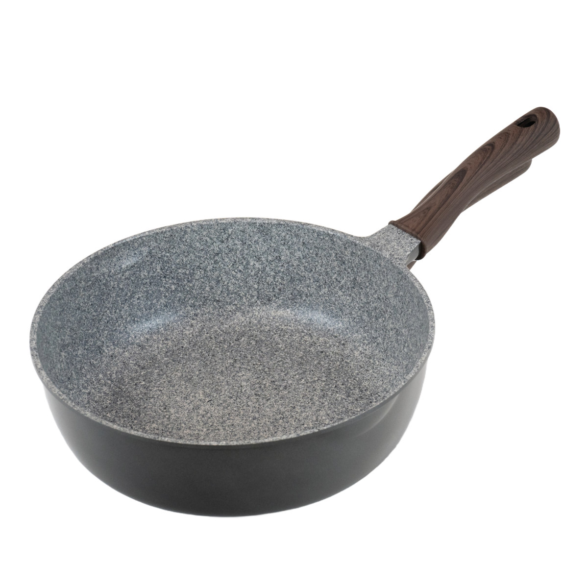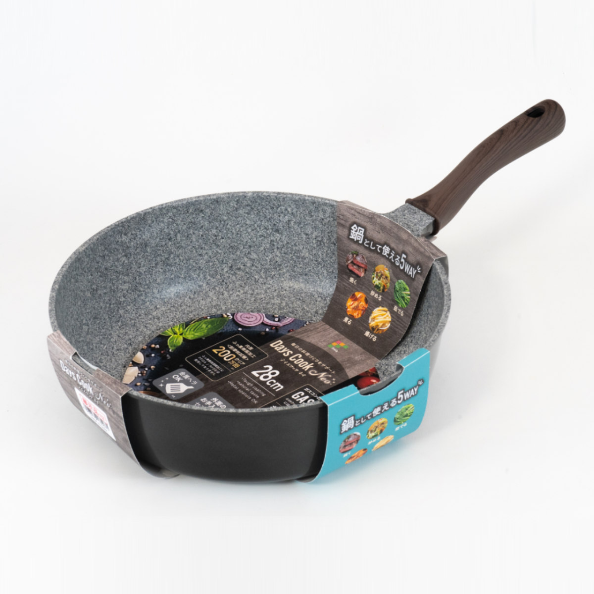 焼く、炒める、茹でる、煮る、揚げる、ができる、深型のフライパンです。内面はグレーのマーブル柄がシックで、ブラック×木目が落ち着いた雰囲気なので、そのまま食卓へ出してもお料理を引き立ててくれます。