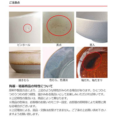 原料や製造方法により、上記のような特性がみられる場合があります。ひとつひとつのうつわの持つ個性、温かみある風合いとしてお楽しみいただければ幸いです。