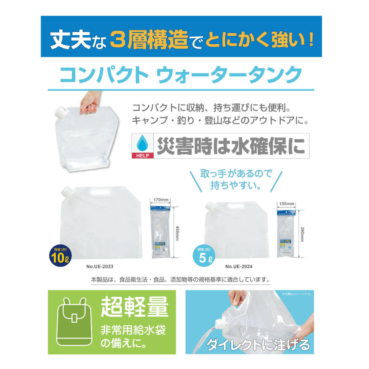 ●キャンプ・釣り・登山などのアウトドアにももちろん、非常用給水袋の備えにもなります。