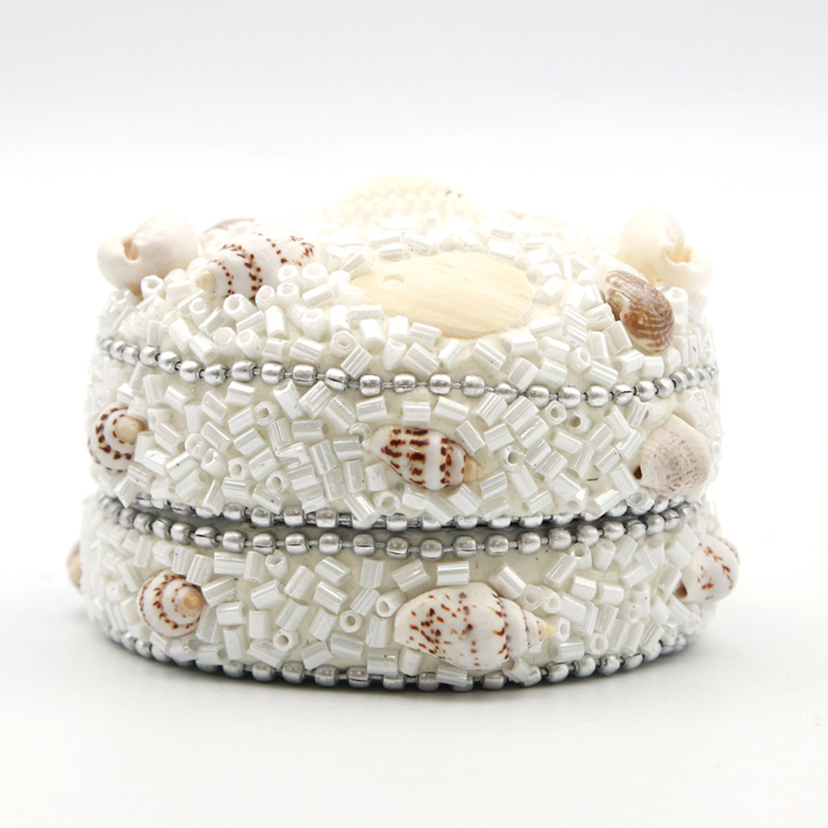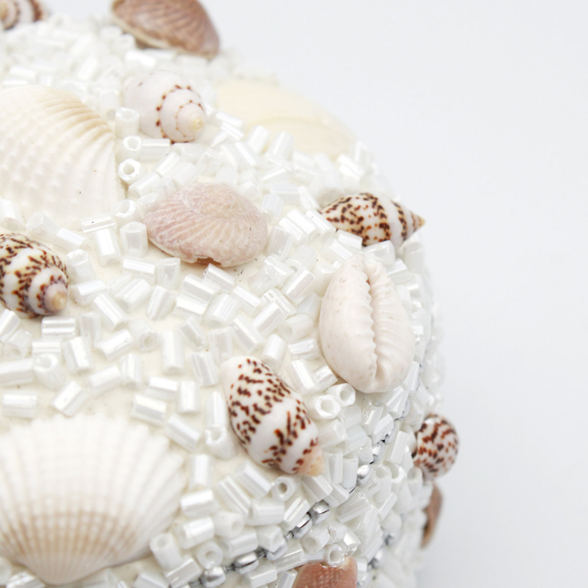 ホワイトカラーのビーズとシェルの繊細な装飾が施されています。ハンドメイドのため、商品によって個体差はありますが、商品の特徴の一つとしてお楽しみください。
