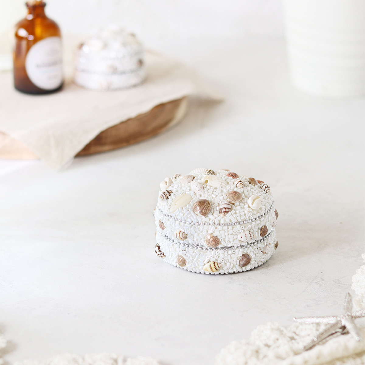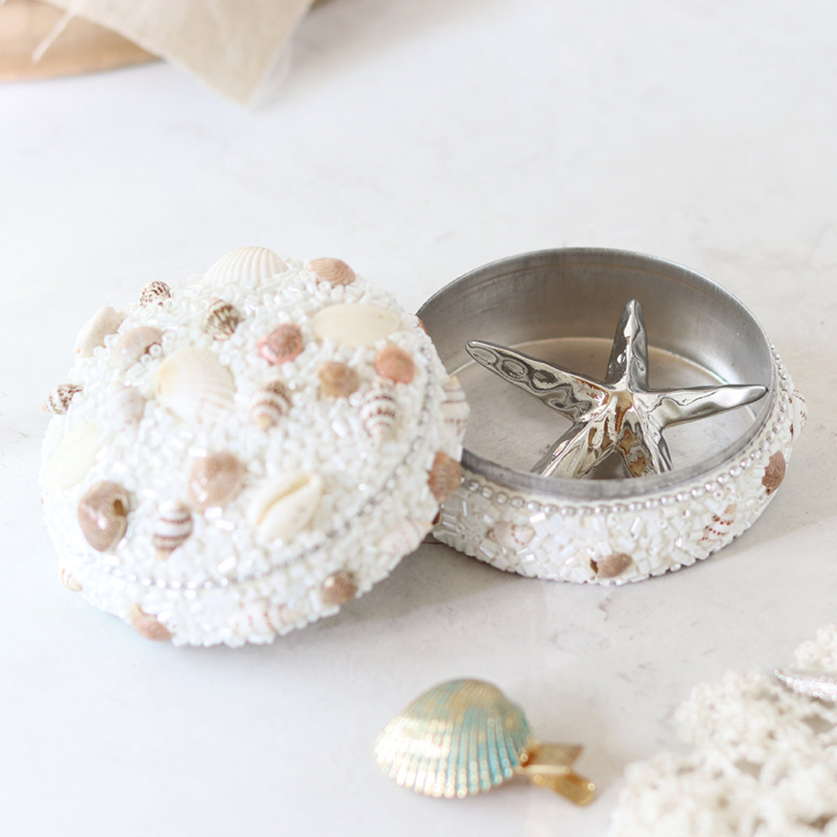 ビーチの爽やかな風景を思い起こすような、美しい小物入れです。マリンテイストなお部屋はもちろん、ナチュラルな空間にもよく合い、ドレッサーや棚上に置くとお気に入りの空間が広がります。