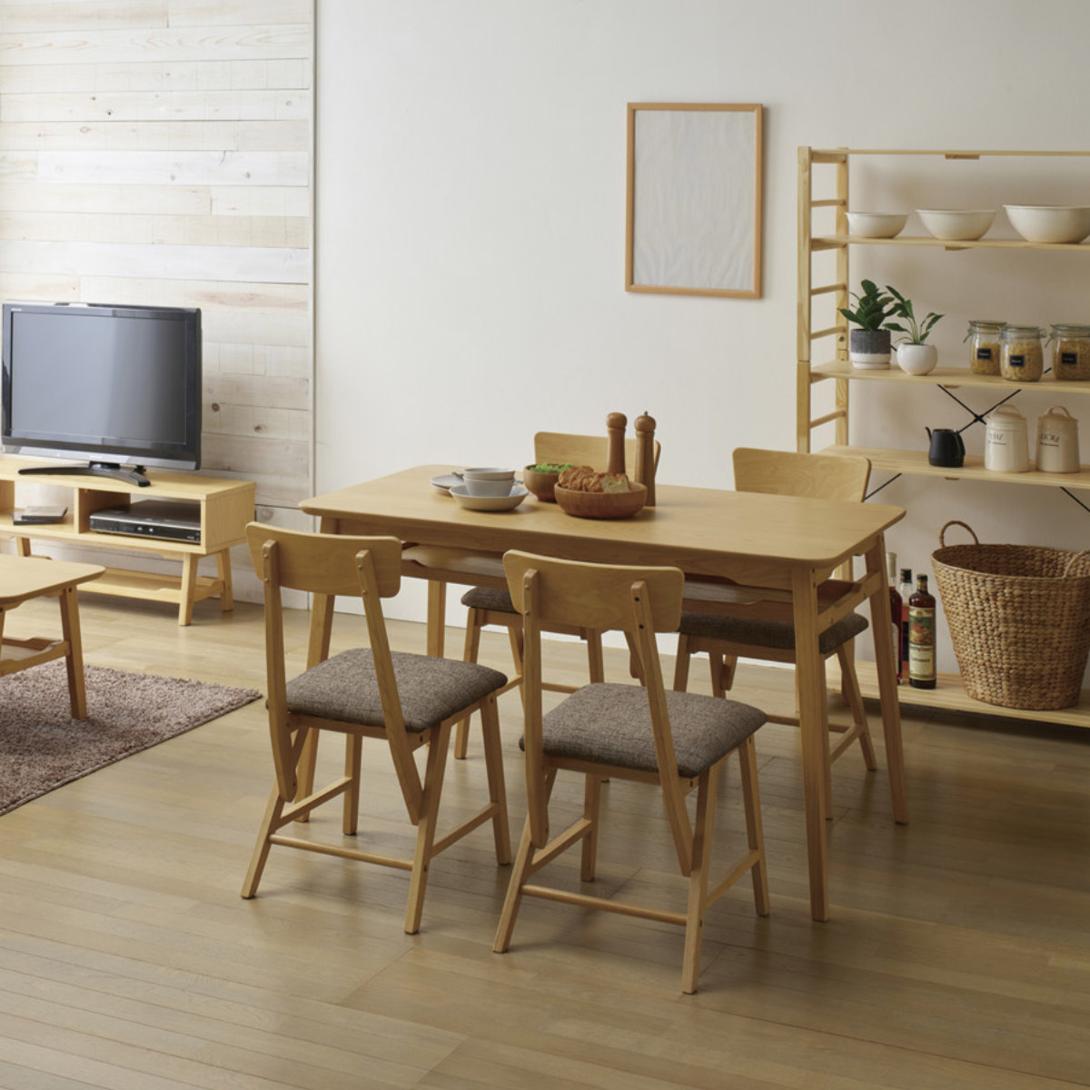| 材質 | フレーム:天然木(ラバーウッド)、塗装 背:合板、ラバーウッド突板貼り、塗装 張地:布(ポリエステル100%) |