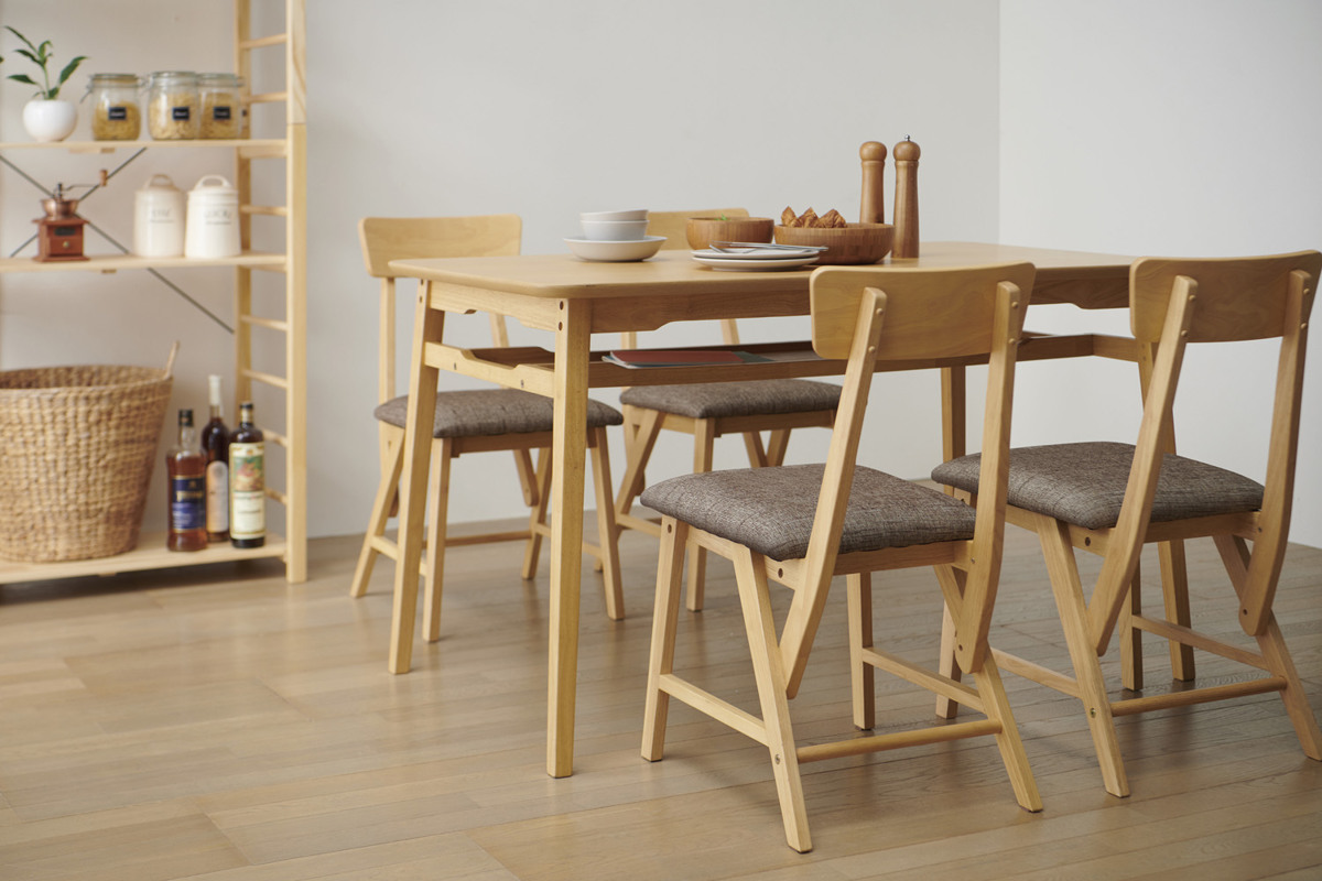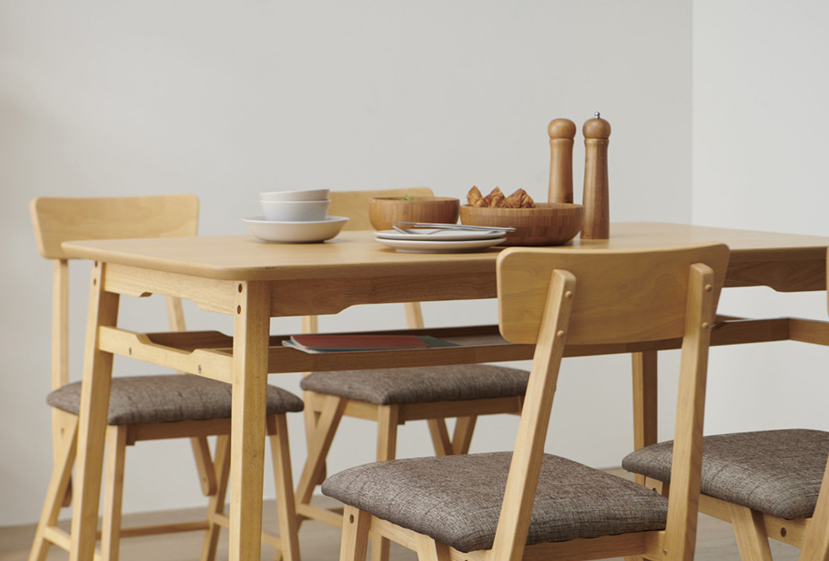 どこか懐かしい雰囲気を感じられるダイニングテーブルです。シンプルなデザインの中にこだわりのエッセンスを盛り込みました。タモの突板を使用した天板を採用し、美しい木目を活かしたナチュラルなカラーが魅力のシリーズです。