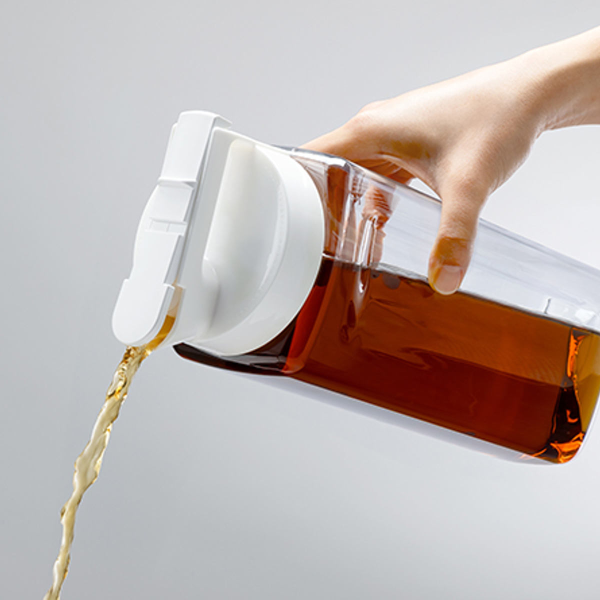 ハンドルを省いたコンパクト設計なので、冷蔵庫のドアポケットにすっきり収まるスクエア型の冷水筒です。容量は作り置きに最適な2.1Lの大容量タイプです。茶渋の付きにくい防汚加工が施され、使いやすさにこだわった機能が詰まった冷水筒です。
