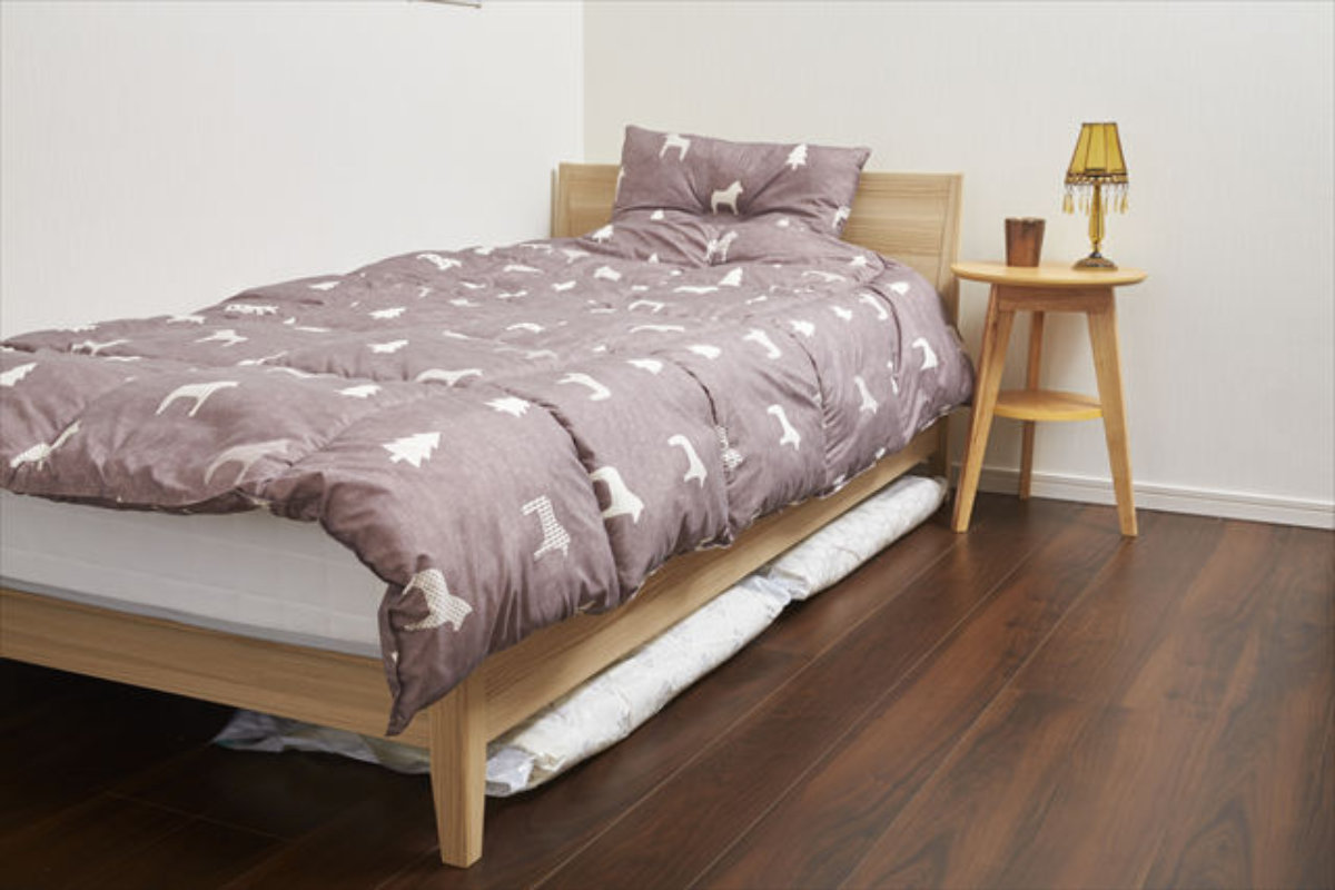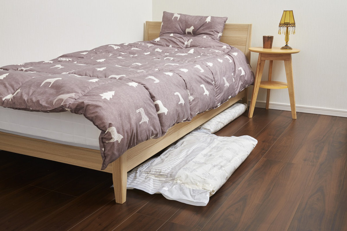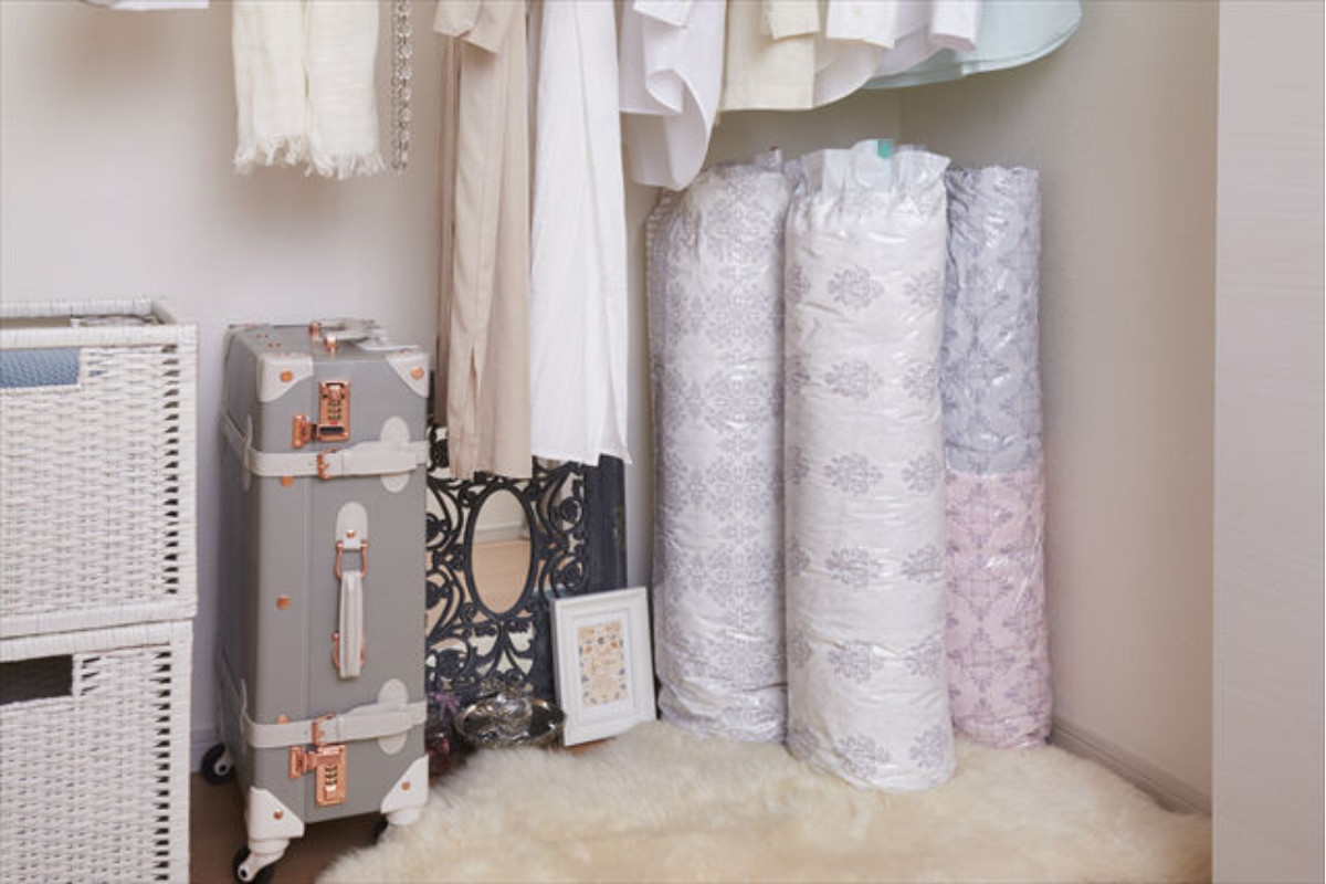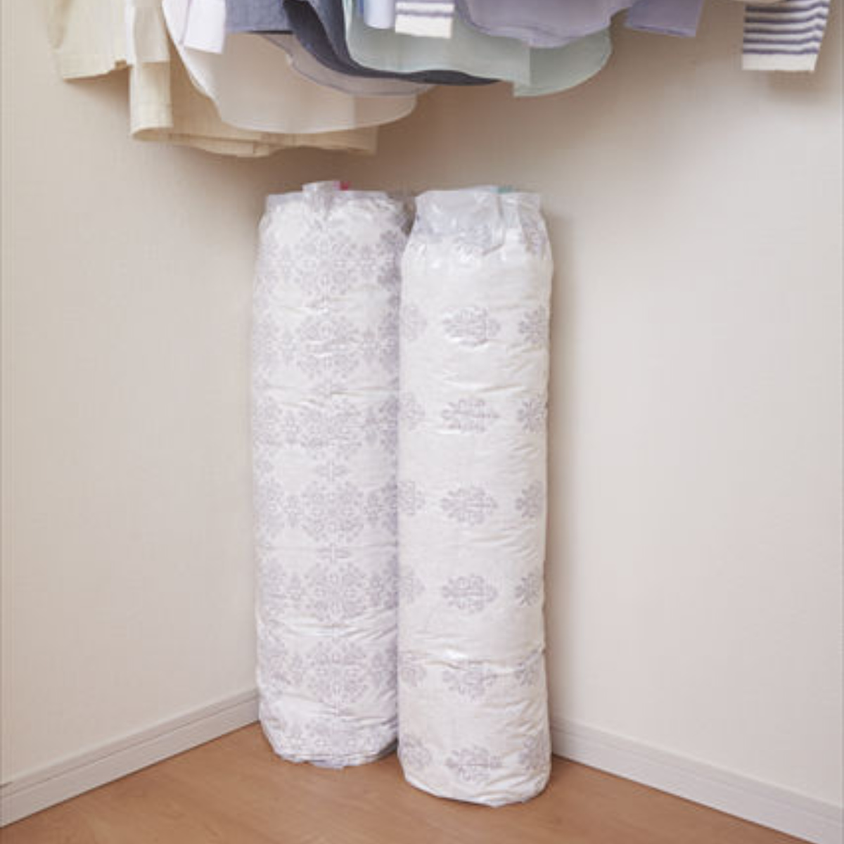 ベットの下や棚上に収納する際は2つ折りで平たく圧縮し、クローゼットに立てかけての収納には筒状に圧縮する方法がおすすめです。圧縮方法を使い分けるだけで、より上手に収納スペースを活用できます。